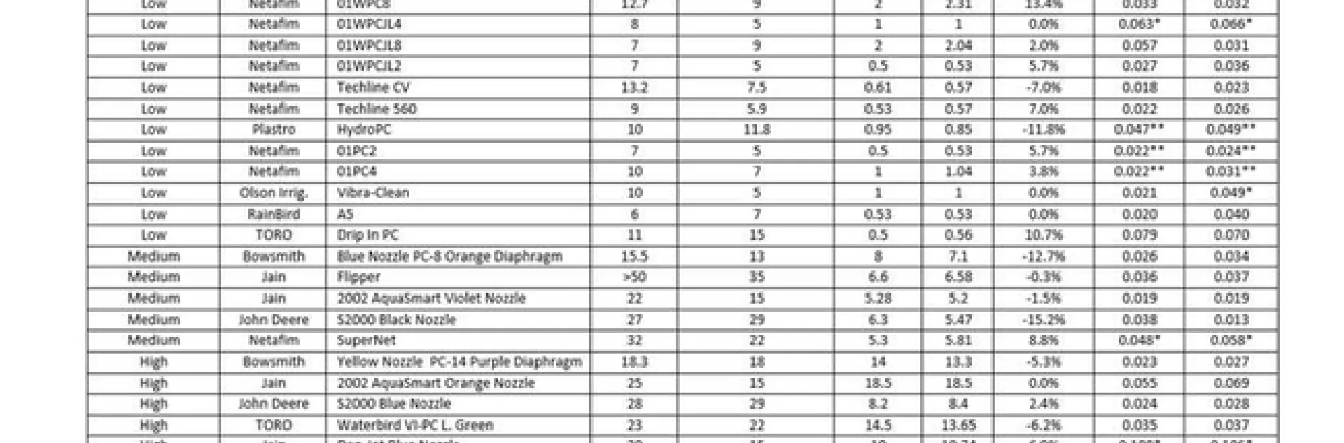 But that the percentage of well-performing products decreased as the designed flow rate increased. Many of the emitters designated as microsprinklers or sprayers, although pressure compensating did not compensate at the normal operating pressures. Often the pressure compensating feature did not start performing until much higher pressures were achieved. Often this occurred when clogging occurred and this clogging often occurred where the pressure diaphragm was located and was not performing. Sediment would get in back of the diaphragm. Effectively the emitters were not pressure compensating. The testing procedure of numerous medium and high flow models also found individual pieces were found to be defective. These faulty emitters had a measurable effect on the evaluation for those models.