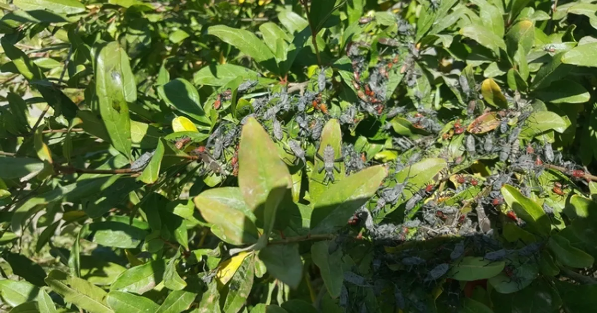 Fig. 1. Aggregation of leaffooted by on pomegranate in early October of 2016. The aggregation is comprised mostly of fifth instar. |