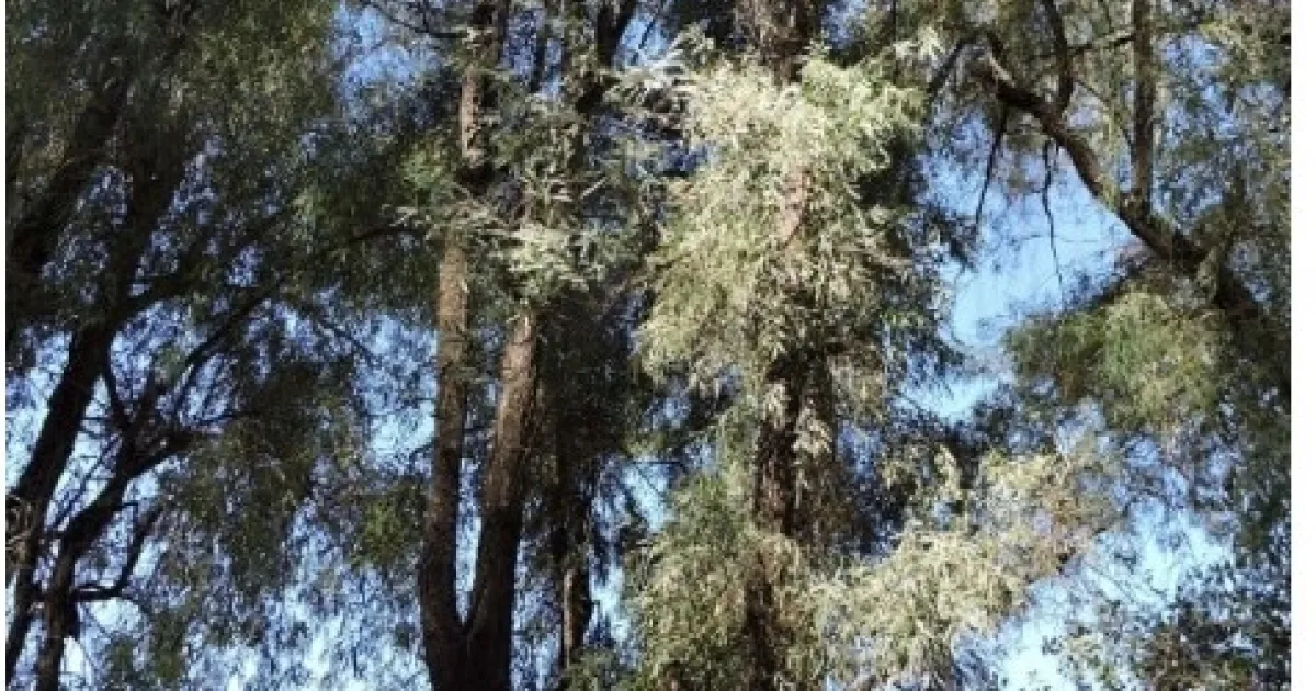 The eucalyptus genus includes around 700 species, most of which are native to Australia. Their resilience and drought tolerance have resulted in extensive plantings around the globe, primarily for timber, but also as shade and windbreak trees . Since 1860, when eucalyptus seedlings first became available for planting in California, they have become the most common non-native tree in the state. Eucalyptus stands are associated with negative attributes including poor habitat for wildlife, allelopathic suppression of plants, high combustibility, and for some species the likelihood of dropping branches unexpectedly or blowing over in high wind events. A positive exception is sites, primarily of blue gum (E. globulus), along the Pacific Coast, which are important overwintering sites for the monarch butterfly (Danaus plexippus); although the butterflies prefer native trees. Several species of eucalyptus are recognized as naturalized in California with the ability to regenerate from seed. Currently, two species of eucalyptus, river red gum (Figure 2) and blue gum, are listed as invasive with limited potential by the California Invasive Plant Council (2020), while a third, sugar gum (E. cladocalyx) is listed in the “watch category.