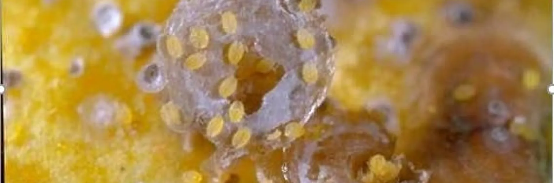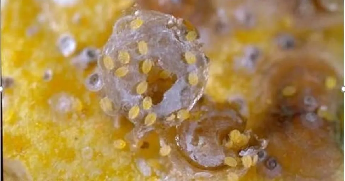 Figure 1. CRS female (overturned) showing crawlers. Crawlers move around looking for feeding spot, settle and spend life on the same spot.