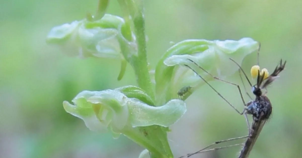 Caption: An Aedes mosquito with pollen sacs on its eyes feeding from Platanthera flowers.