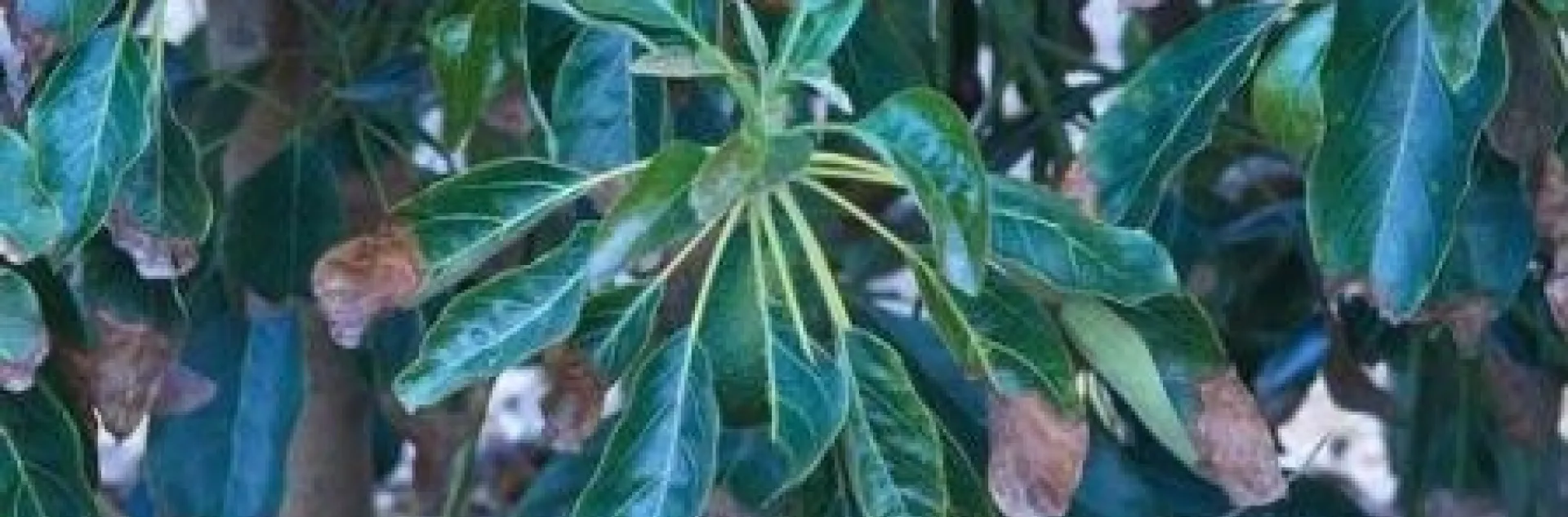 The calls are coming in and have been for the last several months. The trees are tired, worn out and look horrible. What's the problem? Well four years of drought, accumulated salts in the root zone and irrigation practices that aren't removing the salts from the root zone. It sets up a situation of tip burn, but much more extensive than tip burn is the water stress that results from salt accumulation. Salts compete with roots for water and they act to pull water away from the roots. It is as if less water is being applied. The water stress sets up the trees for a fungal infection called variously leaf blight, stem blight and in young trees, death. We used to call this Dothiorella blight, but since the work of Akif Eskalen at UC Riverside, it turns out it is one of many fungi that cause this problem, most of them Botryosphaerias.