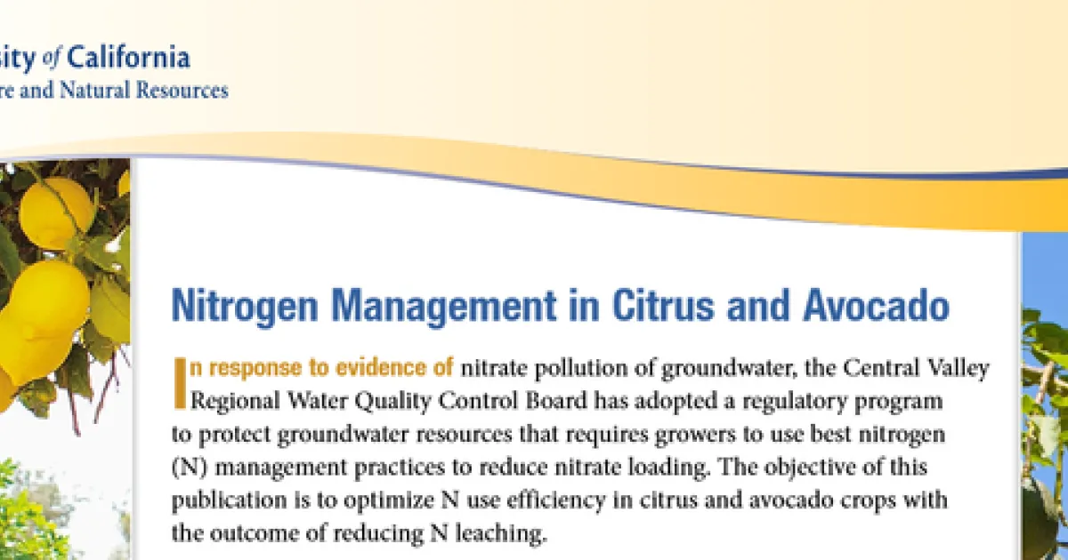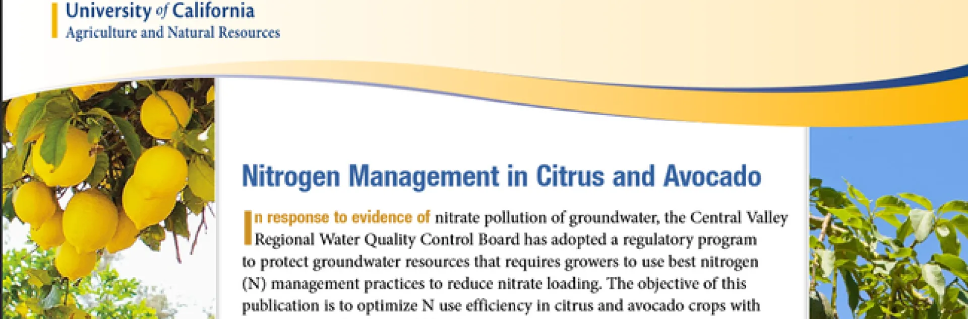In response to evidence of nitrate pollution of groundwater in California, the various Regional Water Quality Control Boards have adopted regulatory programs to protect groundwater resources that requires growers to use best nitrogen (N) management practices to reduce nitrate loading. As a help to growers, this publication has been created to optimize N use efficiency in citrus and avocado crops with the outcome of reducing N leaching.