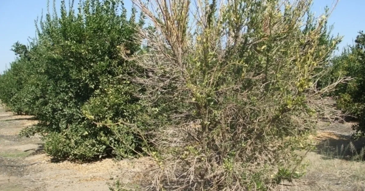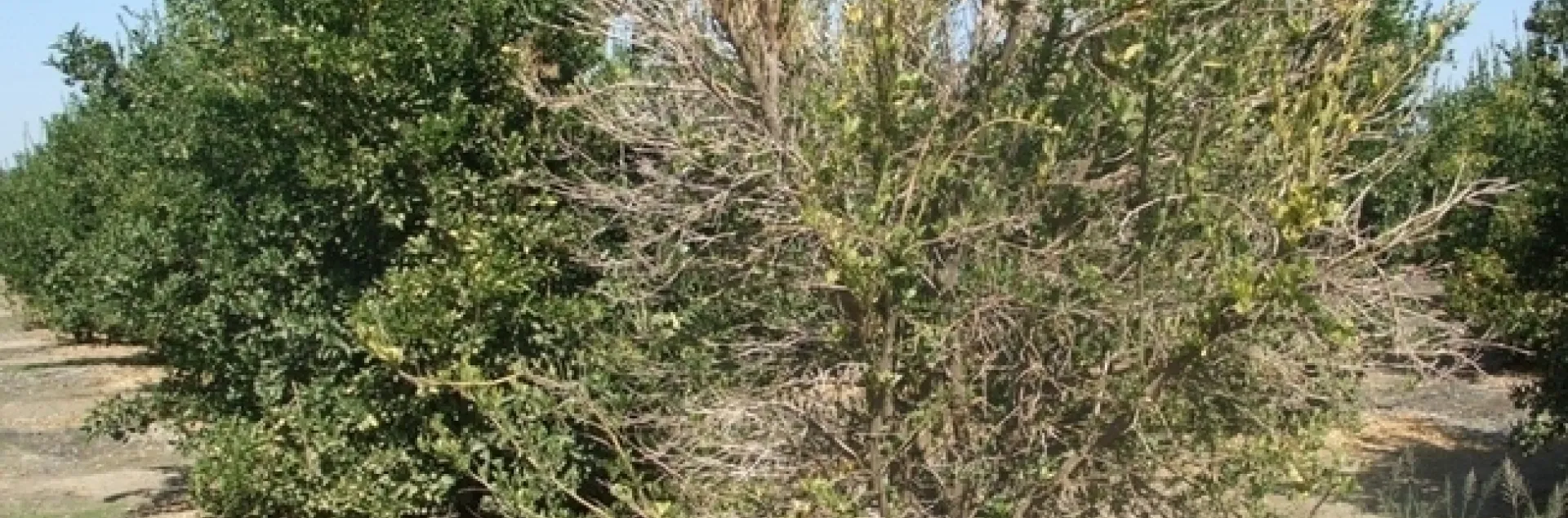 Fig 1. Yellowing and thinning of citrus canopy due to Phytophthora infection.