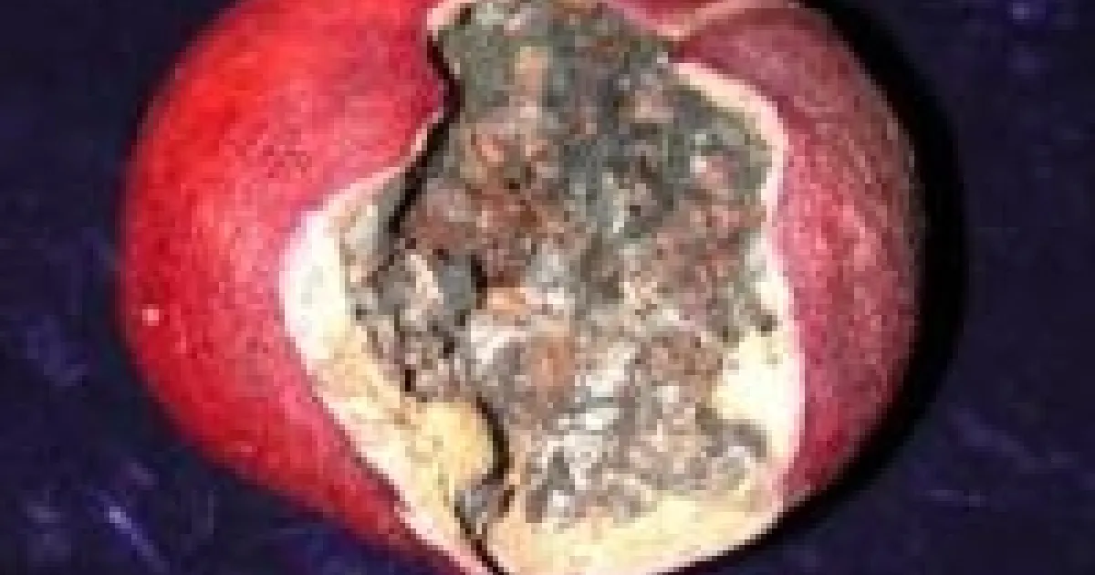Pomegranate (Punica granatum) is a specialty crop now grown on more than 10,000 acres in California. Pomegranate production has increased for both fresh market and juice in the last several years, and with this increase, random internally rotted fruit has become more noticed. The outside of the fruit looks perfectly fine, but internally the fruit is rotted and the arils (the flesh covered seeds that are eaten and juiced) are black. Pretty disgusting. Some fruit recently has shown up at harvest and the grower was unaware of the problem until the fruit was opened by a customer. The only difference between good fruit and affected fruit is that the blackhearted fruit is a bit lighter in weight. The absence of external symptoms makes the diagnosis of the disease very difficult, and consumers encountering the disease may change their perception of the pomegranate's many health benefits.