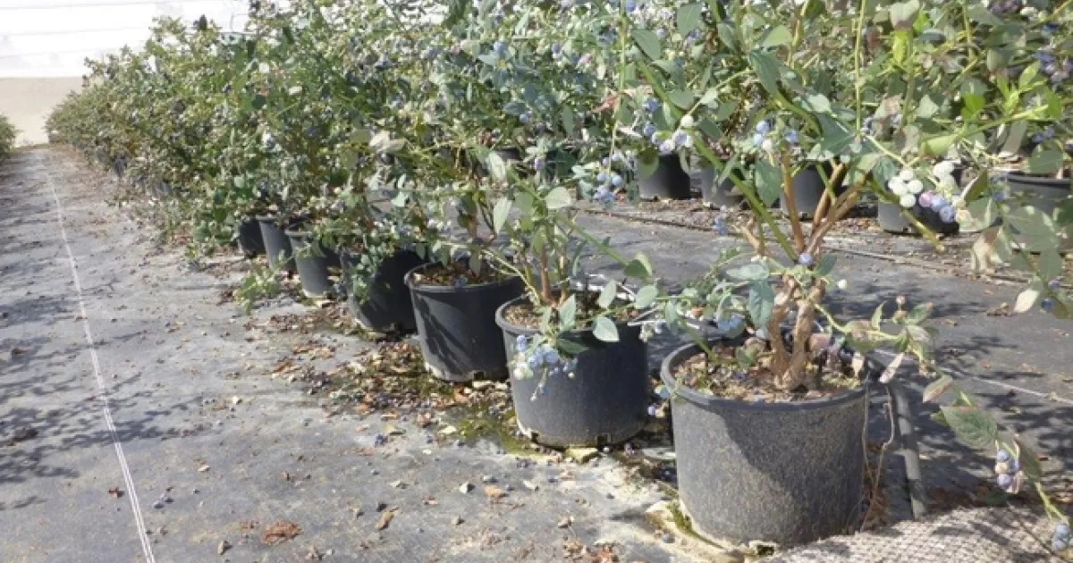 toGrowing blueberries in a pot is not such a whacky idea. Along the coast, they never get as big as the Central Valley or other places where they are grown. That's because they are in almost continuous flower and fruit production. So when they are small, the pots can be put more closely together, reducing water use and weeds. As the plants grow, the spacing can be increased. Also, blueberries are very sensitive to high soil pH which is easier to correct with artificial substrates. They are also prone to Phytophthora root rot, the pesticide for which can't be used by organic growers, but can be controlled by careful irrigation of a pot. So the easier control of weeds and the easier control of root rot would be worth it to an organic grower, even though the initial expenses are higher. Better control typically lead to higher yields. Being able to control plant spacing might also make them less prone to frost damage because they could more easily be covered up when frost is forecast.