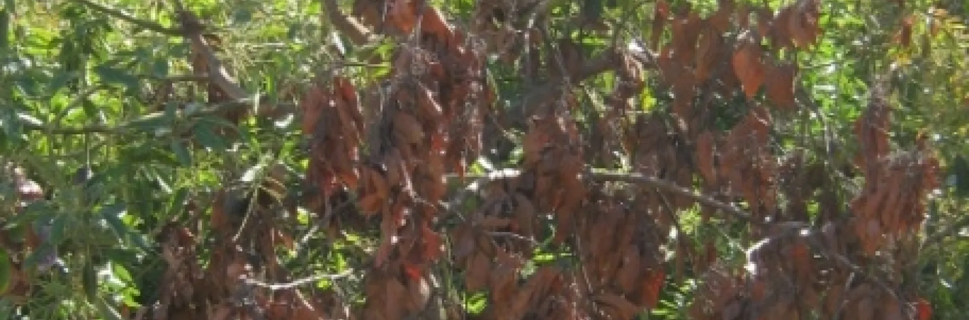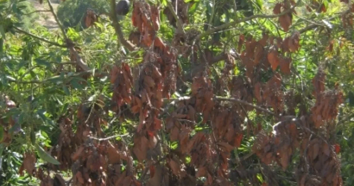 In both avocado and citrus there can be a rapid collapse of tissue brought on by a host of related fungi. The pathogen was once lumped as Dothiorella, but lately University of California extension plant pathologist Akif Eskalen has been able to tweeze out more species which mainly belong to the Botryosphaeria genus. The collapse can be quite rapid, so fast that the leaves continue to hang on to the tree. This disease is more common in years of low rainfall, where inadequate water is being applied (especially when Santa Ana winds are blowing), and where salinity build up has occurred. In the last 2 months, I have been called out to diagnose this problem five times. In each case, they were trees that had been sidelined and neglected or the grower was trying to save money by saving water. Luckily for a mature tree, there can be recovery as long the tree is protected from sunburn that occurs with defoliation. White wash the exposed parts, and wait for recovery. When it is clear what part is recovering, cut into fresh wood to remove the dead parts. For a more detailed discussion of this blight, see our 2009 Topics in Subtropics.