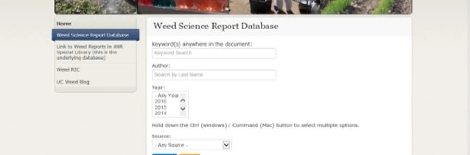 So, to take a stab at this problem, several Weed Research and Information Center colleagues and I started building a UC Weed Science Report Database. We used an existing database platform in the UC ANR system but built a web interface with a simple search function for key words, authors, publication year, or several broad categories of reports. We elected to use an "all word search" rather than to manually categorize each report by weed/crop/herbicides, trade names vs chemical names, etc.