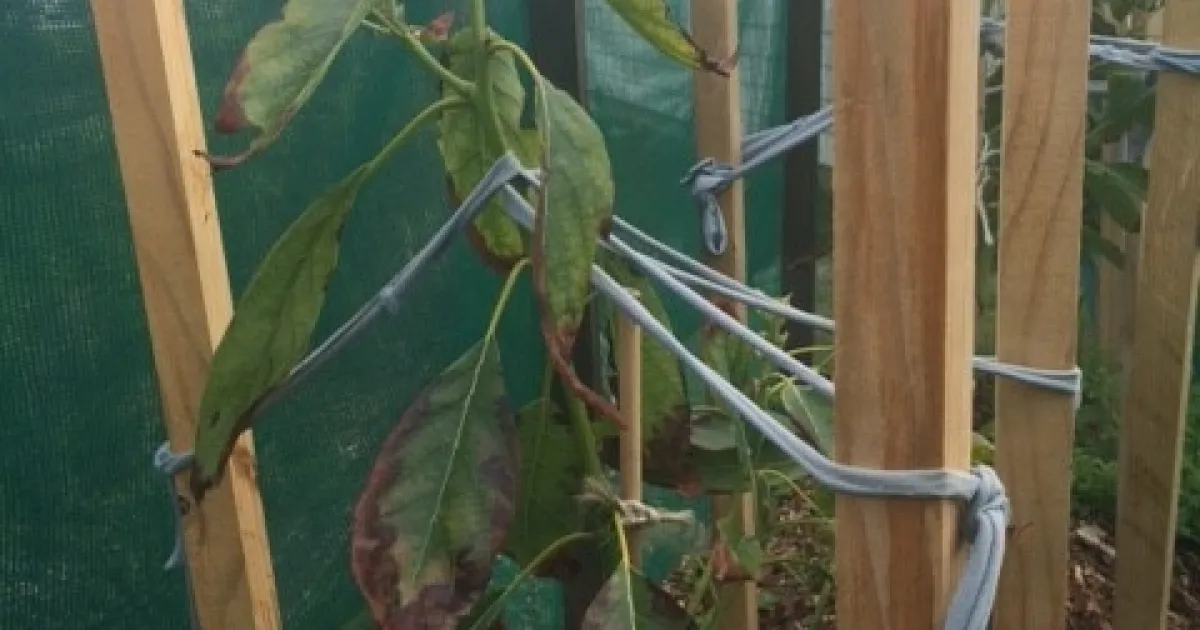 Lepidopteran larvae will more commonly feed in a smooth pattern, not the rough pattern seen here. Now with this dead tissue, the wind blows it out, and what's left is the uneven margin. No it's not time to spray an insecticide. It's time to reflect on irrigation. There's a lot of this damage out there now. On avocados, citrus, landscape plants. It's going away until the leaves drop and are replaced with new ones, that will hopefully be well hydrated by rain and proper irrigation.