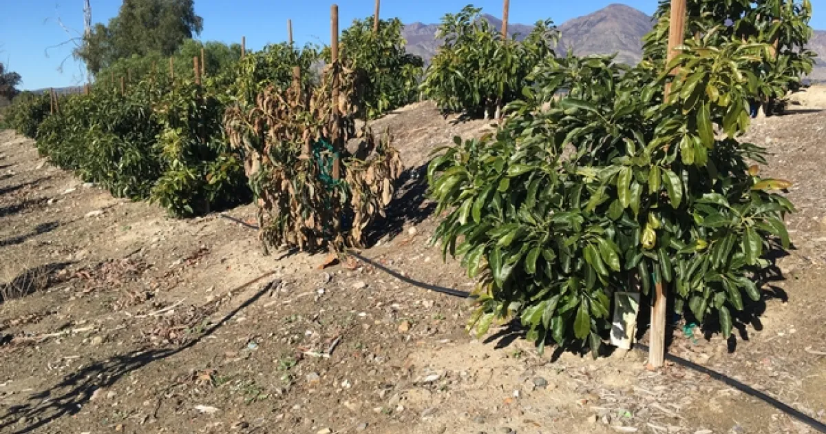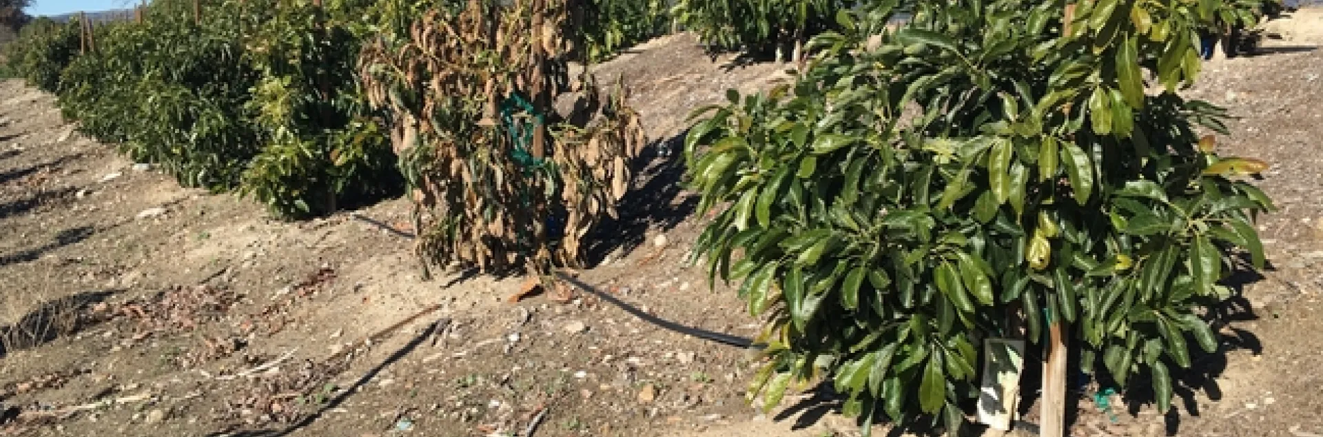 It's winter time and avocados and other subtropicals are prone to frost damage. Little trees especially that haven't developed a canopy that can trap heat are the most prone. So it gets cold and all the orchard looks fine, but there's one tree that doesn't look right and in a couple of days it really stands out.