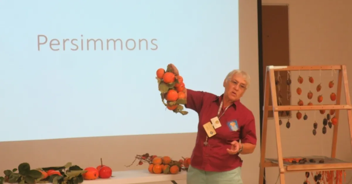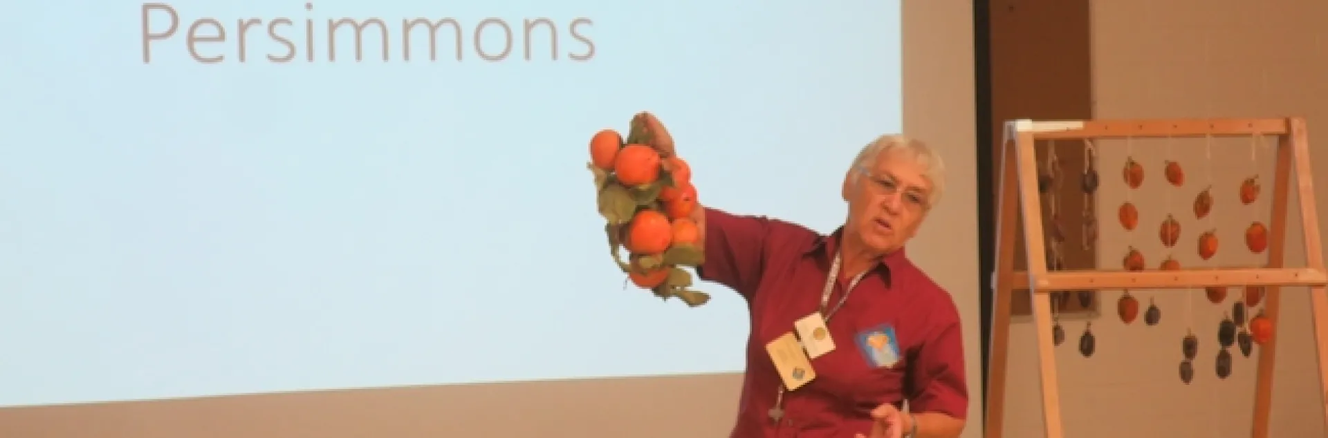 A group of fifteen attended the Persimmon Harvest Workshop held on November 16, 2018 at the South Coast Research and Extension Center. Here to learn cultural practices from UCCE Master Gardener Isabel Barkman, and ways to incorporate this fall delight into recipes from UCCE Master Food Preserver, Joanne Byrd, the attendees were treated to a demonstration from both on how to dry persimmons using the Japanese Hoshigaki method and modern techniques with electric food dehydrators.