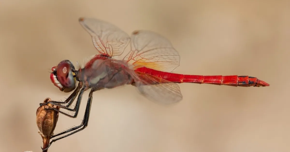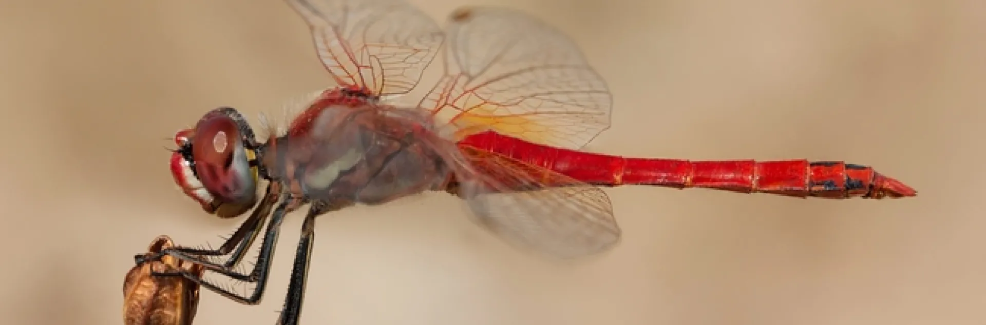 Dragonflies belong to the insect order Odonata, which means “toothed”, for their serrated mandibles − entomology-speak for jaws with teeth-like projections. Adult dragonflies feed on soft-bodied insects such as mosquitoes, flies, moths, butterflies, and flying ants, ambushing them in mid-flight. They have almost 360-degree vision due to their huge compound eyes and can see many more colors than humans can. Dragonflies are amazing flyers, achieving speeds over 30 miles per hour, and are able to fly forwards, backwards and remain stationary with the help of flight muscles that control each of the four wings separately.