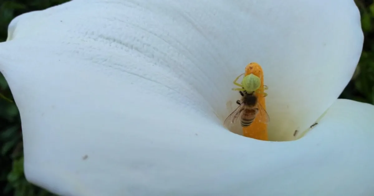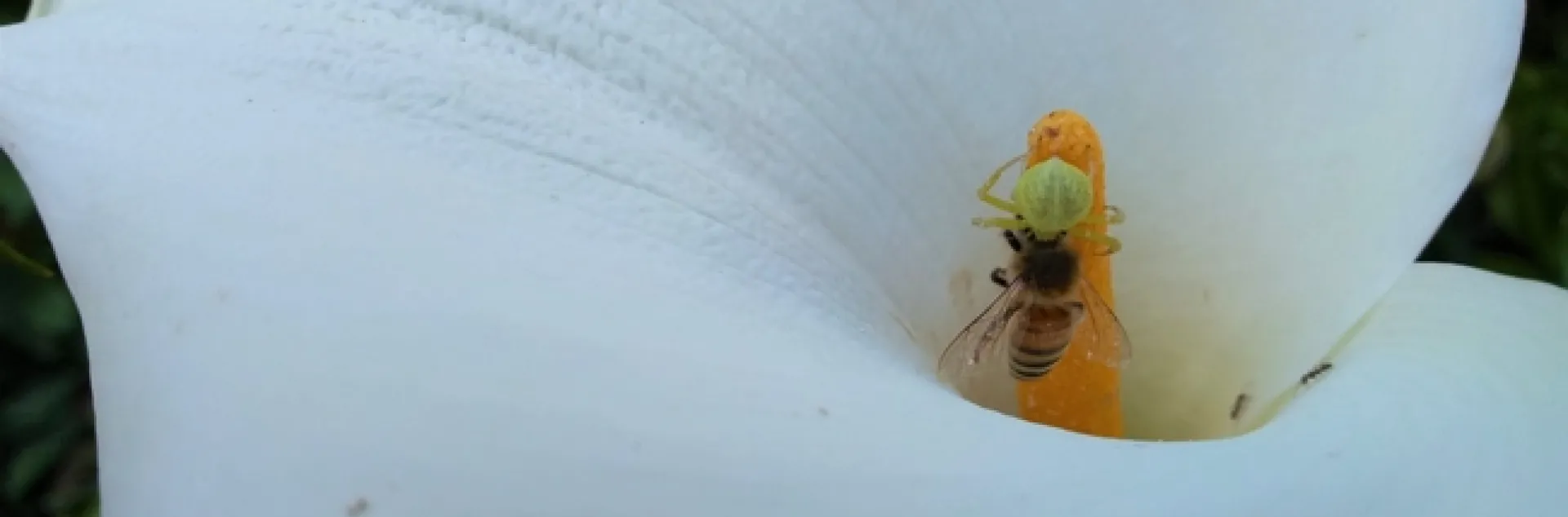As I was poking around my garden and looking at flowers, my eye suddenly fell on an odd-looking green spider carrying a honey bee on the spadix of a calla lily. My first thought was “poor bee”, working so hard to pollinate flowers and then getting caught by a spider – life is not fair!