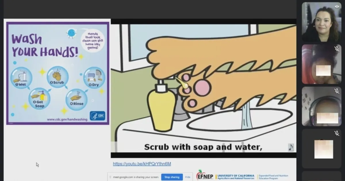 Food safety is one of the four core areas of the Expanded Food and Nutrition Education Program (EFNEP). California EFNEP, a statewide program of UC ANR, teaches food safety and safe food handling practices as part of the nine-lesson nutrition series for limited-resource families in 19 counties. Adult participants, mostly those responsible for preparing meals for the family, learn reliable food safety information based on research such as food safety basics, the four core practices to prevent foodborne illness, safe minimum cooking temperature, and proper storage of leftovers. In addition to teaching concepts, EFNEP educators demonstrate proper handwashing and other safe food handling practices during recipe demonstration. Youth participants in lower grades (K-2) learn about when and how to wash hands. EFNEP educators use the Glo-germ demonstration, which illustrates proper handwashing. Youth in upper grades also learn about food safety basics and how to store and handle food safely. During the pandemic, EFNEP quickly pivoted to offer classes virtually so that food safety lessons could continue. During the 2020 program year, EFNEP statewide delivered food safety lessons to 2,981 adult participants and 1,323 youth.
