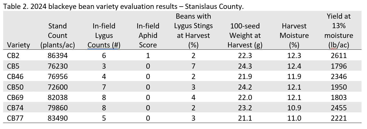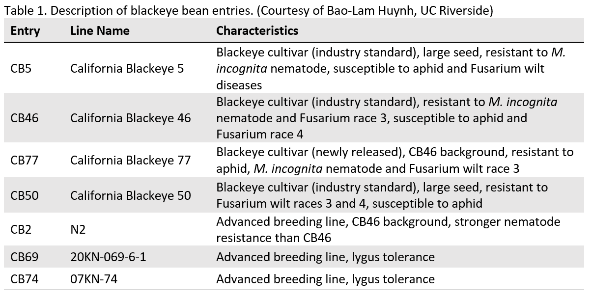 We thank the cooperating grower for hosting the trial, UC Riverside blackeye breeder Bao-Lam Huynh for coordinating statewide activities, and the CA Dry Bean Advisory Board for assistance with statewide research prioritization.