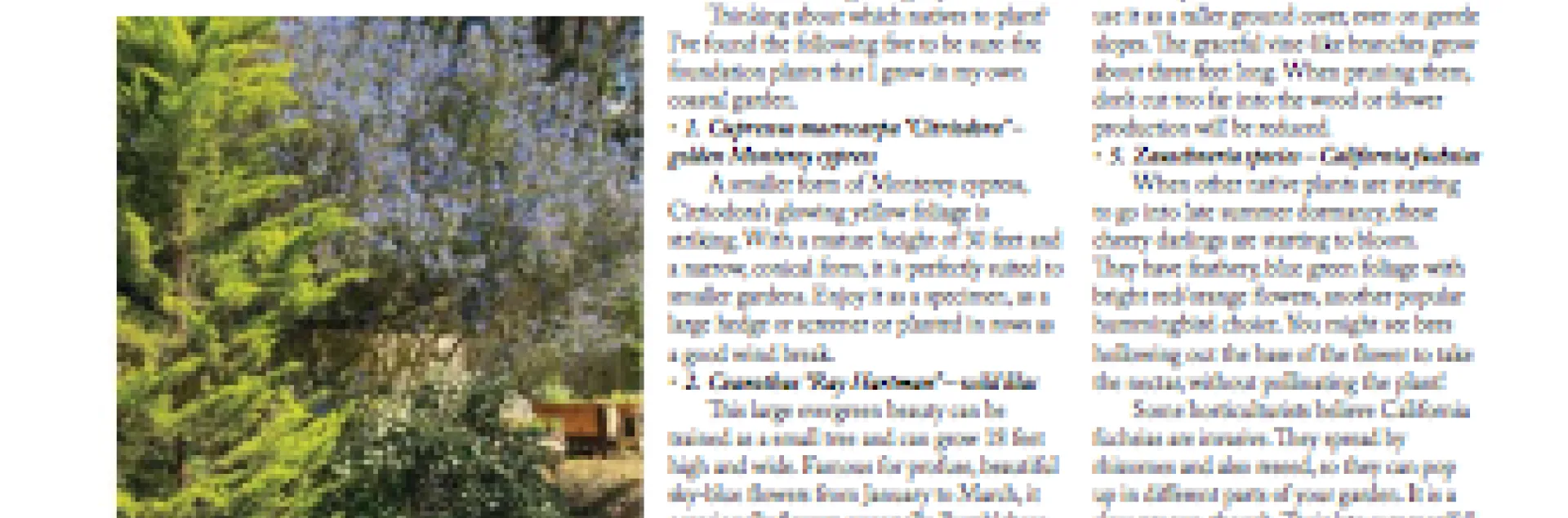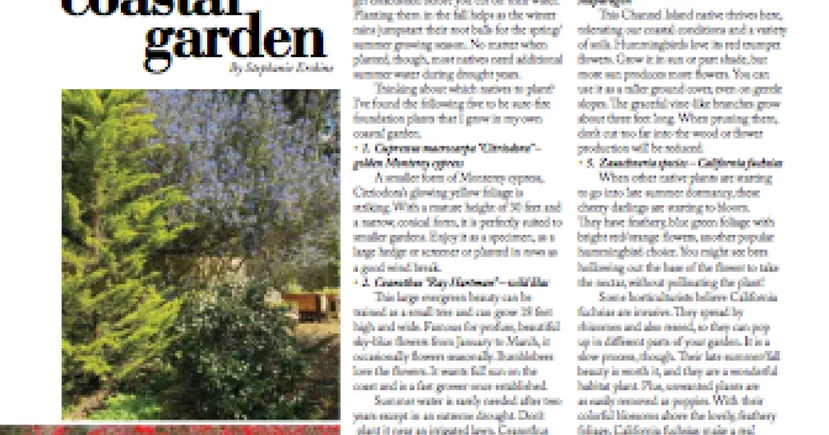Finding plants for coastal gardens can be challenging. While many California natives do well, others need the inland heat to look their best, but whether inland or coastal, natives need at least two years of summer water to get established before you cut their water off. Planting them in the fall helps as the winter rains jumpstart their root balls for the spring/summer growing season. No matter when planted, though, most natives need additional summer water during drought years.