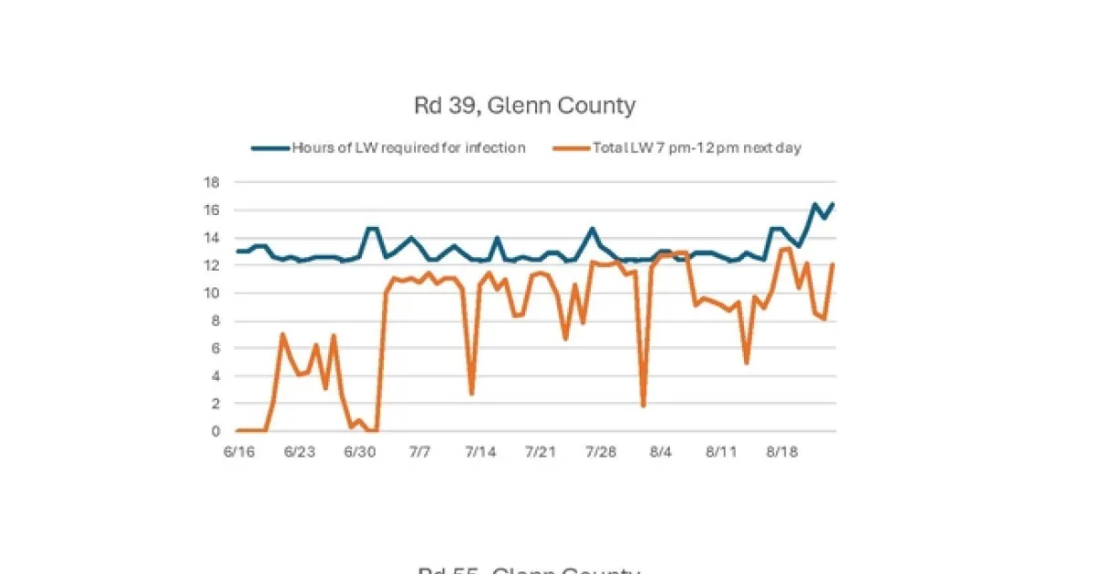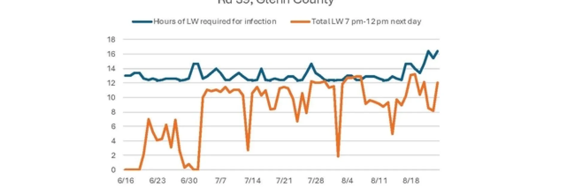 I just wanted to do a quick update on blast. I have not seen any other blast besides the one I reported on an earlier post. PCAs that I have spoken to have not seen blast either. With the cooler temperatures, conditions for blast are not as good. The hours of leaf wetness (LW) required for infection are higher when temperatures are cooler (see figures below). We'll see what happens as temperatures warm up again, but we know that as the crop matures, blast infections are less likely. However, I don't want to say we won't see any blast - last year we saw blast infect some fields late in the season. We'll keep monitoring.