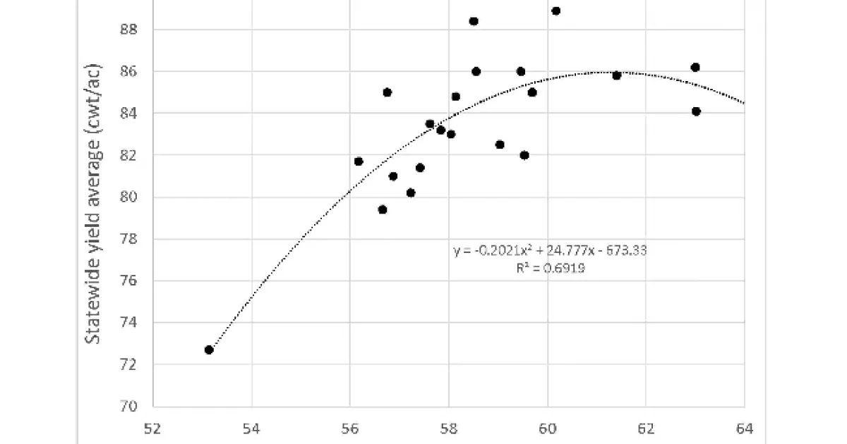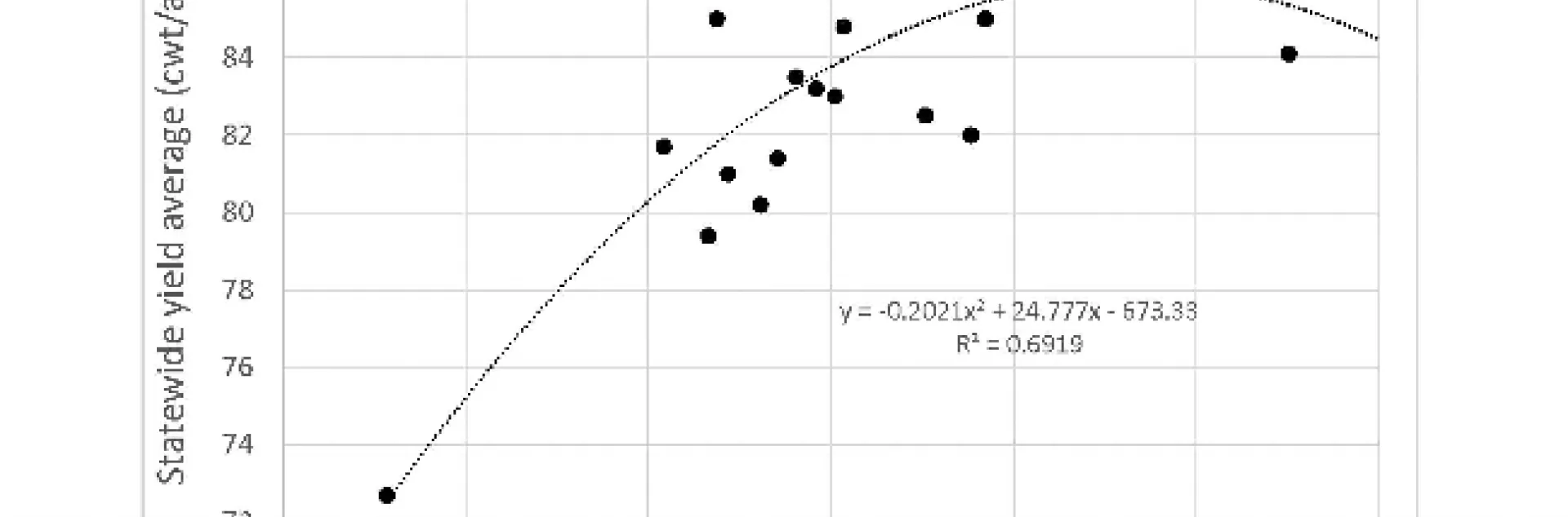 The period between panicle initiation (PI) and heading is critical with respect to grain formation. During this time, cold temperatures can result in pollen sterility as the plants go through meiosis. Pollen sterility results in blanking. Nighttime temperatures below 58 oF can result in sterility. The Figure shows the relationship between average low temperatures during booting and statewide yields. Data are from 1992 to 2018. The data represent the average low temperature for a 15-day period beginning about one week after panicle initiation to one week before heading.