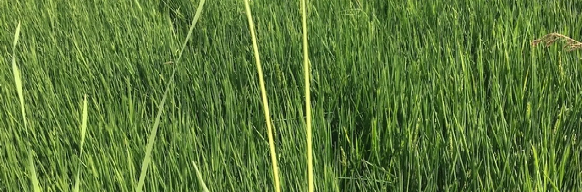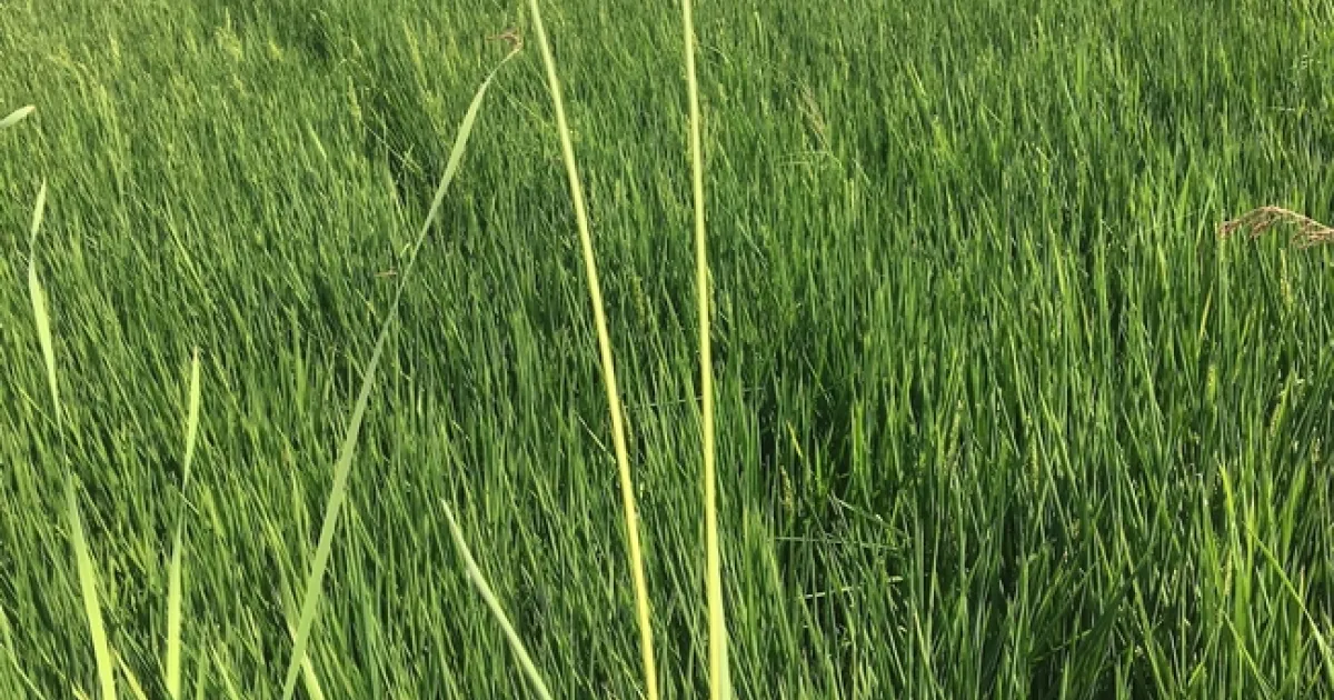 Every year we see some off-types in our public varieties that have a genetic mutation we call elongated upper internode. This mutation causes the internode below the panicle to elongate, resulting in panicles that stick above the canopy. Some have confused this abnormality with weedy rice.