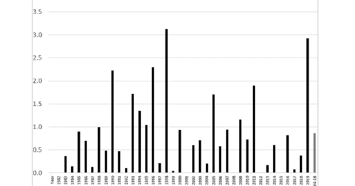 During the January UCCE Rice Winter Grower meetings I asked the audience a number of questions related to how they managed rice in 2019 when they planted during or after the mid to late May rains. As you recall, 2019 May rainfall was one of the highest on record with almost 3 inches falling between mid to late May (see Figure below showing average May rainfall from three CIMIS stations (Durham, Colusa and Davis). Thanks to all of you who participated. We had roughly 140 people respond. About 50% of farmers reported planting their last field by May 25; however, almost 40% of respondents said their last rice field was planted after June 1. These June plantings were more common on fields located east of the Sacramento River as most farmers were able to get their fields in earlier on the west side. Over 80% of the respondents said that in fields planted after the rains, yields were down by up to 10 sacks/ac; while 15% said they were the same. Also, about 25% of farmers reported that grain quality was lower in the late planted fields.