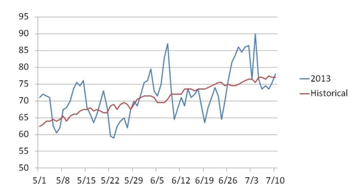 A few weeks ago I was on the phone with a grower worried that he had put too much nitrogen on his rice for the cool year we were having. Then, the weather turned and got really hot. So, are we in a cool or warm year? What is the trend so far? It is hard to come with an answer just by comparing the daily average temperatures for this year to the historical average temperatures.