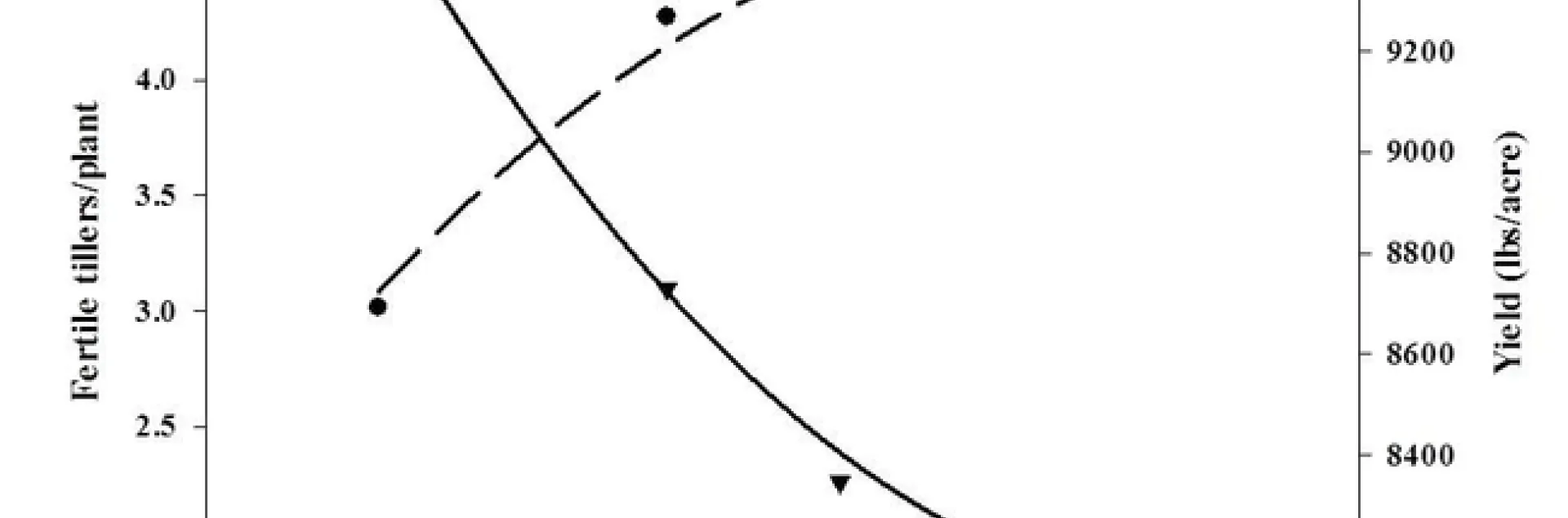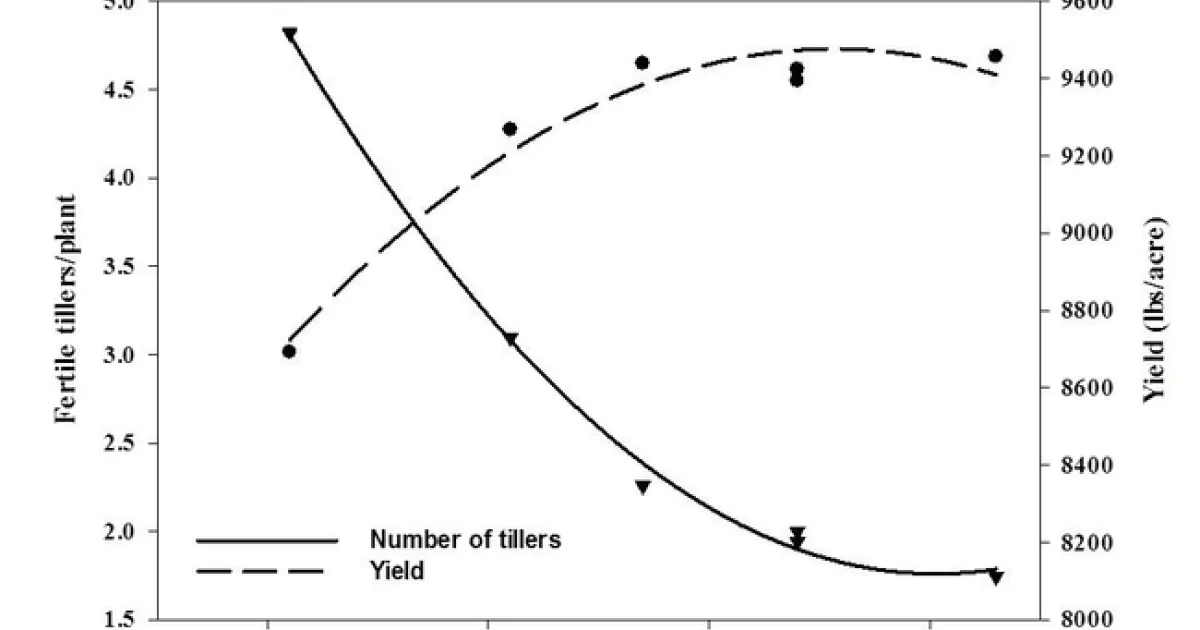 Yields under thin or dense stands may not vary much. Because of their tillering capacity, plants can compensate for a thin stand by producing more tillers, and still reach high yields, as shown in Fig. 1. Research in California has shown that to avoid the problems related with thin and dense stands, take full advantage of the tillering capacity of rice plants, and produce good yields, plant densities must be between 15 to 20 seedlings per square foot.