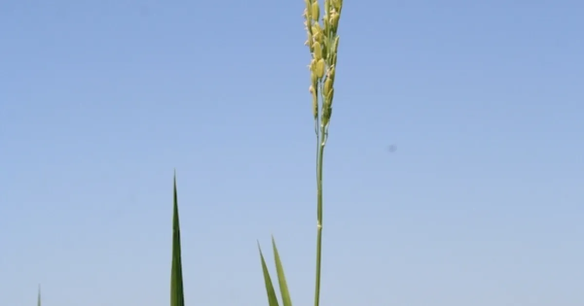 2) Elongated Upper Internode (EUI): this is a genetic abnormality of common medium grain rice varieties that causes the part of the stem attached to the rice panicle to elongate. The panicles stick up above the canopy, just like weedy rice. However, the rest of the plant will look just like the variety planted in the field.
