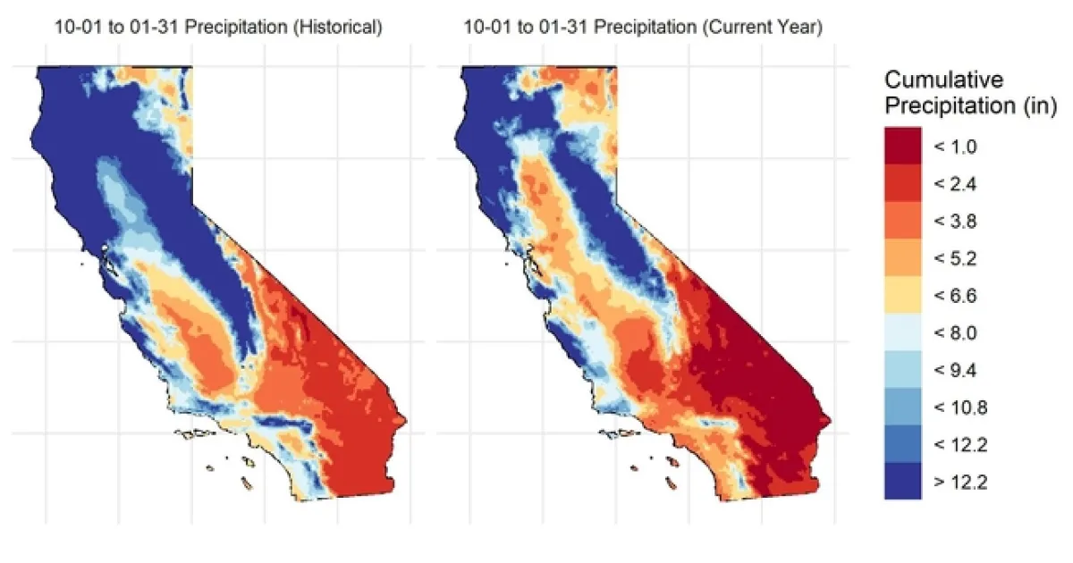 Here, users can choose a specific location and enter a date range of interest. The website uses these inputs to produce interactive graphs of precipitation and temperature patterns. The graphs show the historical (10-yr average) and current season data making it easy to compare this season to other seasons and to see changes over time. Forecasts are also available in the main crop-growing regions of California (e.g. Figure 2). Users can also download their location-specific data for further exploration.