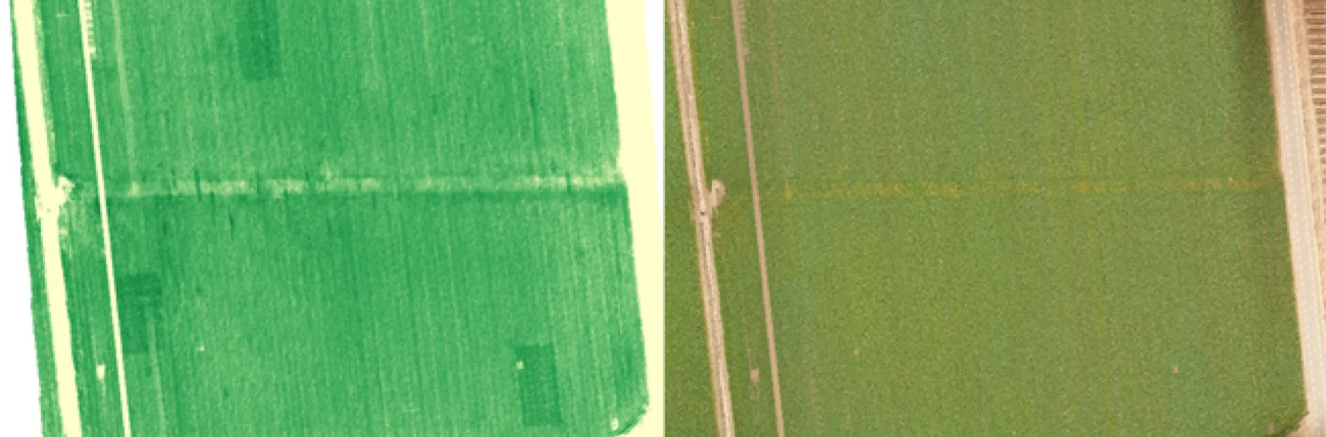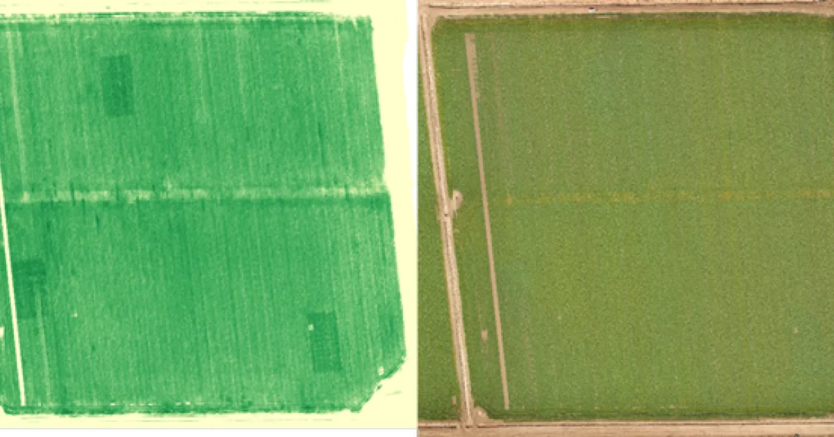 Figure 1. Demonstration site in Solano County on 2/20/20 showing crop N deficiency signal. The three N-rich reference zones appear in the NDRE measurement (on the left) but are not visible to the naked eye (RGB image on the right).