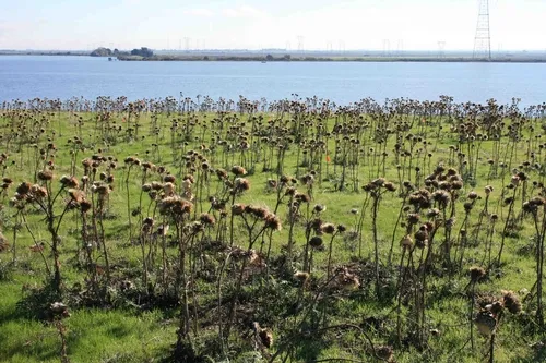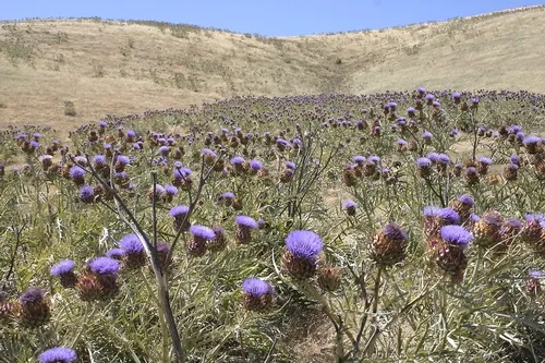 This plant invades low-elevation rangeland in the foothills around the Sacramento Delta and the San Francisco Bay Area. Once artichoke gets established, it spreads into a dense, spiny patch. Cattle avoid grazing it, and the patch keeps getting bigger. Cattlemen, recreational area managers, and natural resource districts all want to get rid of this plant.
