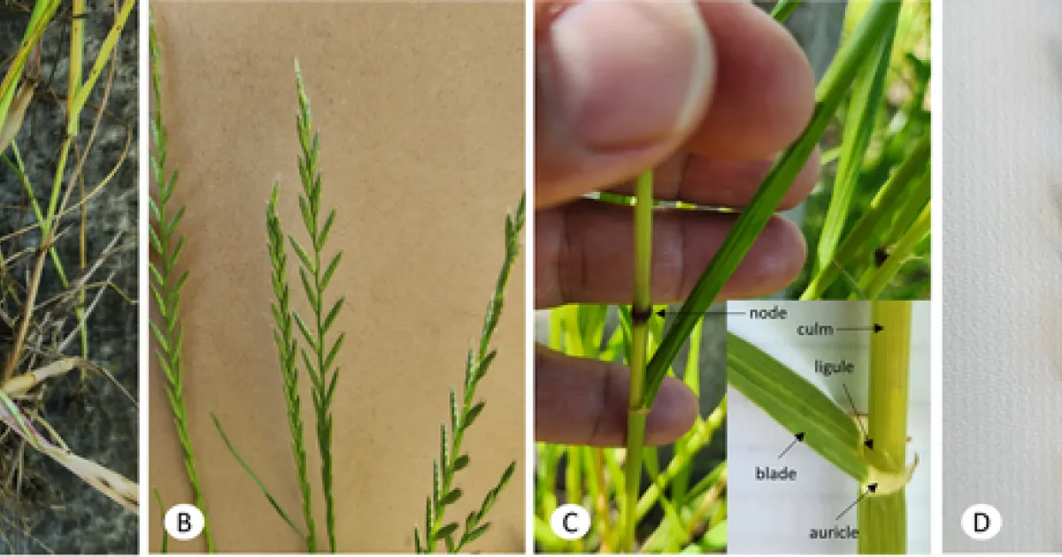 In California, Italian ryegrass [Lolium perenne L. spp. multiflorum (Lam.) Husnot] has been around for a long time and is a major weed in orchards, vineyards, field crops, fallow fields, and so on. It grows vigorously in winter and early spring. Italian ryegrass is a short, rhizomatous, that grows from 11 to 35 inches tall, often with erect stems exhibiting purple coloration at the base. That species can be identified by its dark green, glossy, and hairless leaves that are rolled in the bud. Auricles are well-developed and the shape can vary from clasping to blunt, and the ligules are long and membranous. Once flowering occurs, Italian ryegrass is easily distinguishable by alternating spikelets that run along the length of the main seed head stem. The seed heads range from 3 to 12 inches and consist of solitary small stalkless spikelets (Fig. 1). Additional details regarding identification can be found on the UC IPM website.