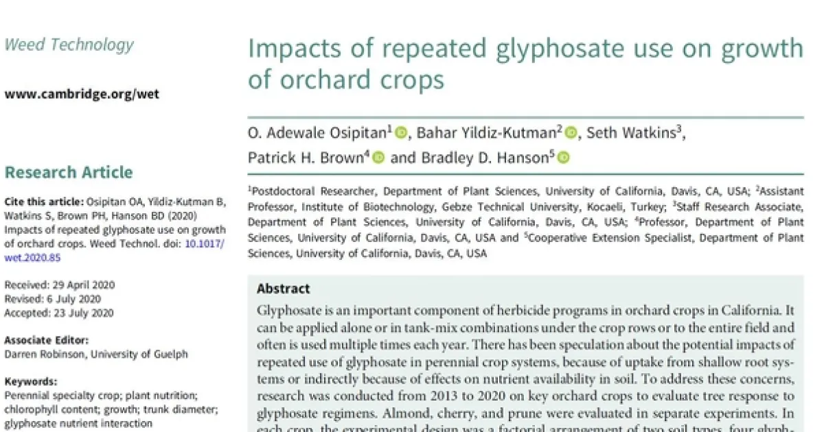 Osipitan OA, Yildiz-Kutman B, Watkins S, Brown PH, Hanson BD (2020). Impacts of repeated glyphosate use on growth of orchard crops. Weed Technol. doi: 10.1017/wet.2020.85 (available at: https://www.cambridge.org/core/journals/weed-technology/article/impacts-of-repeated-glyphosate-use-on-growth-of-orchard-crops/26697F334626A587765C75C2B0F76A3D)