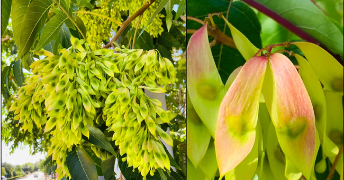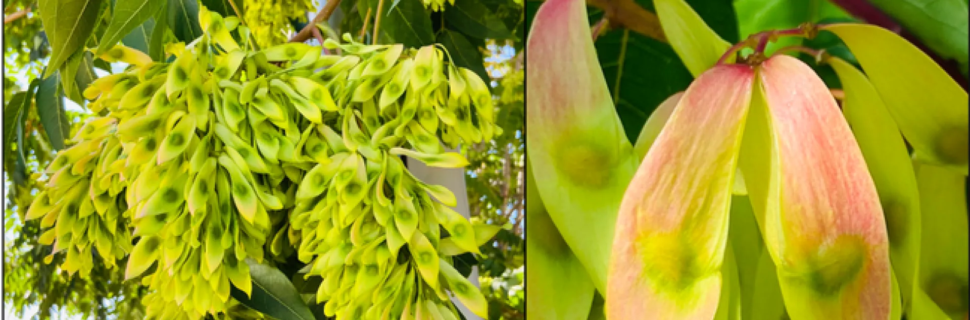 In addition to supporting the growth of economically damaging insect pests, the tree-of-heaven has its own impacts on the ecology of areas where they establish. The tree-of-heaven competes with native plants and trees by releasing allelopathic chemicals that prevent the establishment and inhibit the growth of native trees nearby (Fig. 1C). The tree has a rapid growth rate of 3 to 6 feet a year and is able to start bearing seeds within 2 to 3 years. Female trees can produce more than 300,000 seeds (Fig. 2A) that are easily dispersed by the wind allowing for new trees to establish some distance from the parent tree. Established trees can also spread by sending up root suckers up to 50 feet from the parent tree. In addition, small root fragments can also generate new shoots. An injured or cut tree-of-heaven responds by producing numerous root sprouts that allows the tree to spread prolifically and complicates efforts to remove the invasive tree. The tree-of-heaven is a high pollen producer aggravating those with allergies. Direct contact can cause skin irritation and, in rare cases, inflammation of the heart muscle has been documented from exposure to sap through broken skin. These features of tree-of-heaven fuels its ability to invade new environments and makes it very difficult to remove after it has become established.