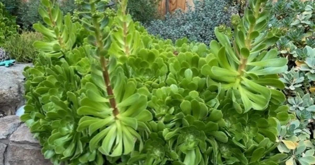The last picture was just taken in mid-January 2022. Some of the biggest ones are about to bloom. Aeoniums are monocarpic, so after blooming, the heads will die off. Some gardeners prune off the stems before blooming, to preserve the plant's energy. But since there is a good mass of aeoniums here, I will let them bloom and enjoy their beauty.