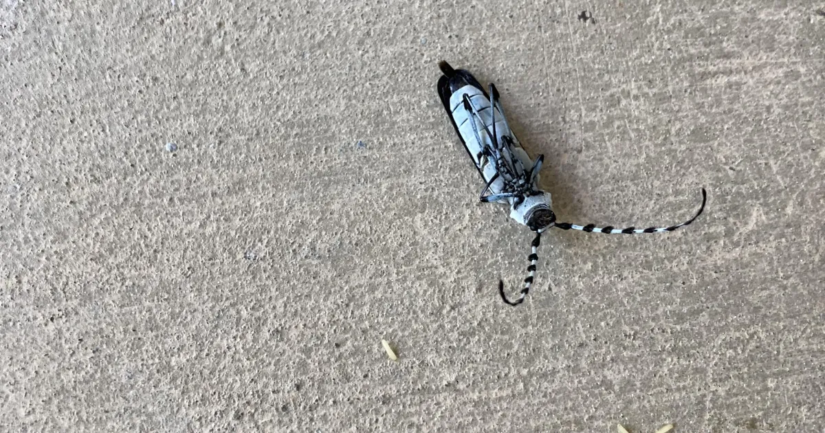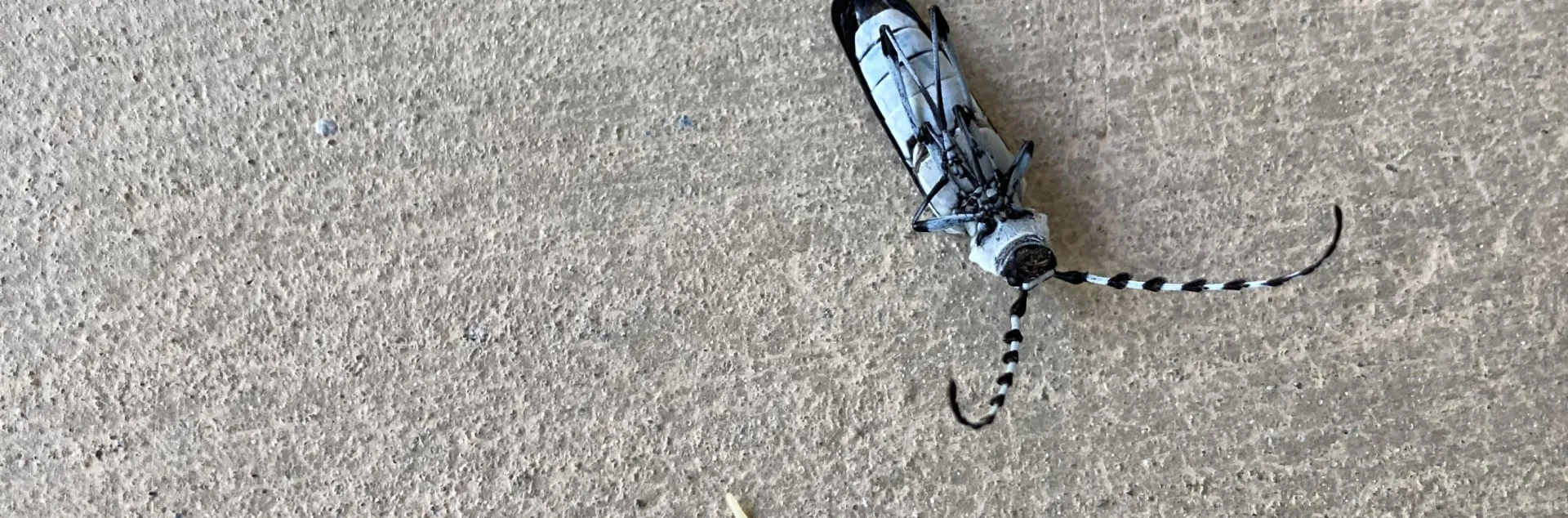 Almost a month ago, I stepped out onto my patio to discover an insect I had never seen before. She was about 1 ½ inches long, not counting her long antennae. What was striking about her was the coloration: alternating bands of light blue and black, even on the antennae. Her entire underbelly was light blue. There were tiny rice-like grains near her. Since I had just cleaned the patio less than an hour earlier, and there was no wind, I guessed they were her eggs. Unfortunately, she appeared to be dying. Why, I can’t say, because the house hasn’t had insecticide used on it for over two years.