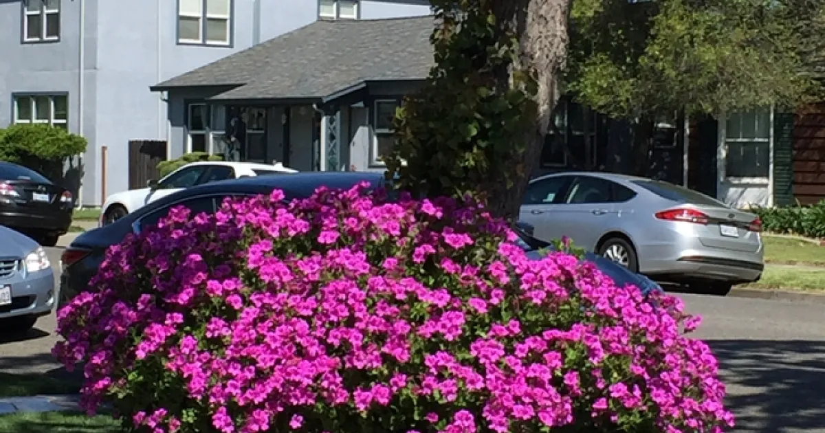 At the Master Gardener Garden Tour last Sunday, several Master Gardeners gathered around a gorgeous mound of magenta flowers, snapping pictures and asking each other what kind of plant it might be. A quick Google search identified it as a Pelargonium, often mistakenly called a Geranium. Further online searching of colorful photos helped identify it as a variety called, 'Pink Aurora'.