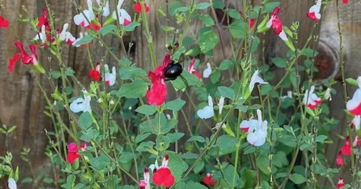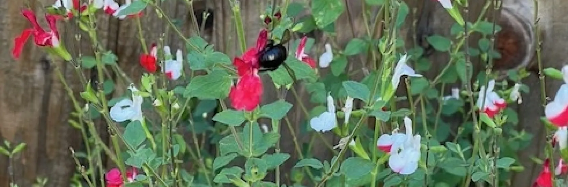 Salvia microphylla' Hot Lips' is a perennial favorite. It is not a native, but you wouldn't know it from the number of carpenter bees kissing Hot Lips.