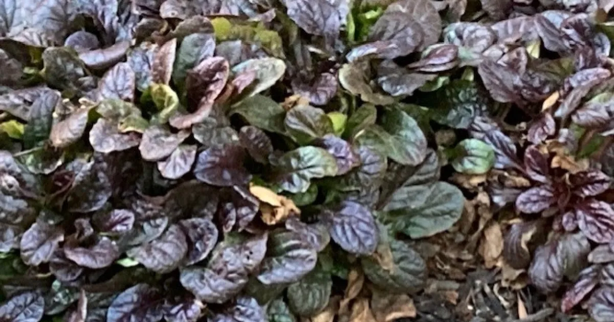 Black Scallop Bugleweed (Ajuga reptans) ‘Black Scallop' – mostly black leaves, seasonal purple flowers