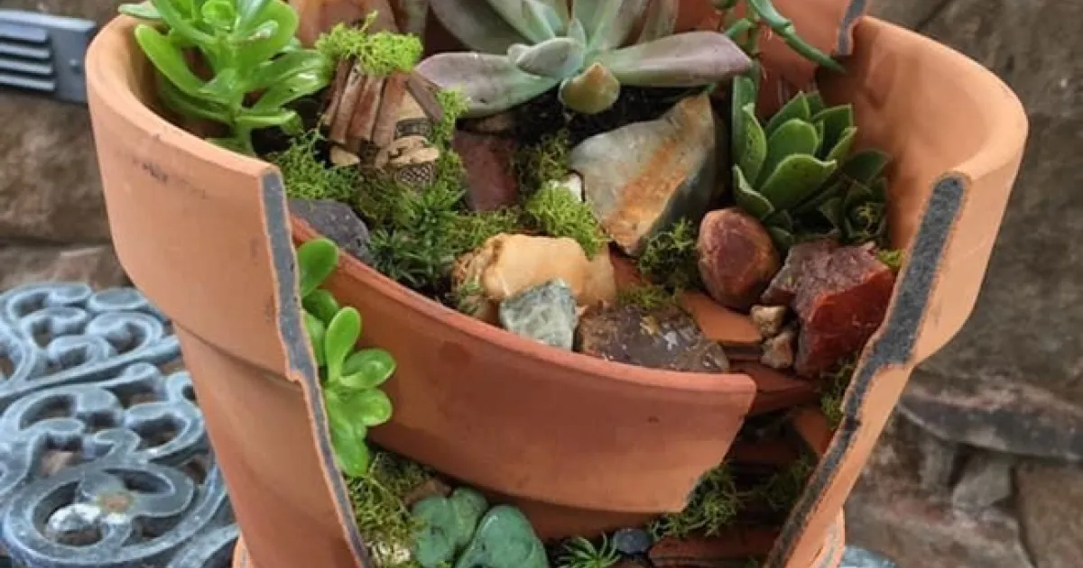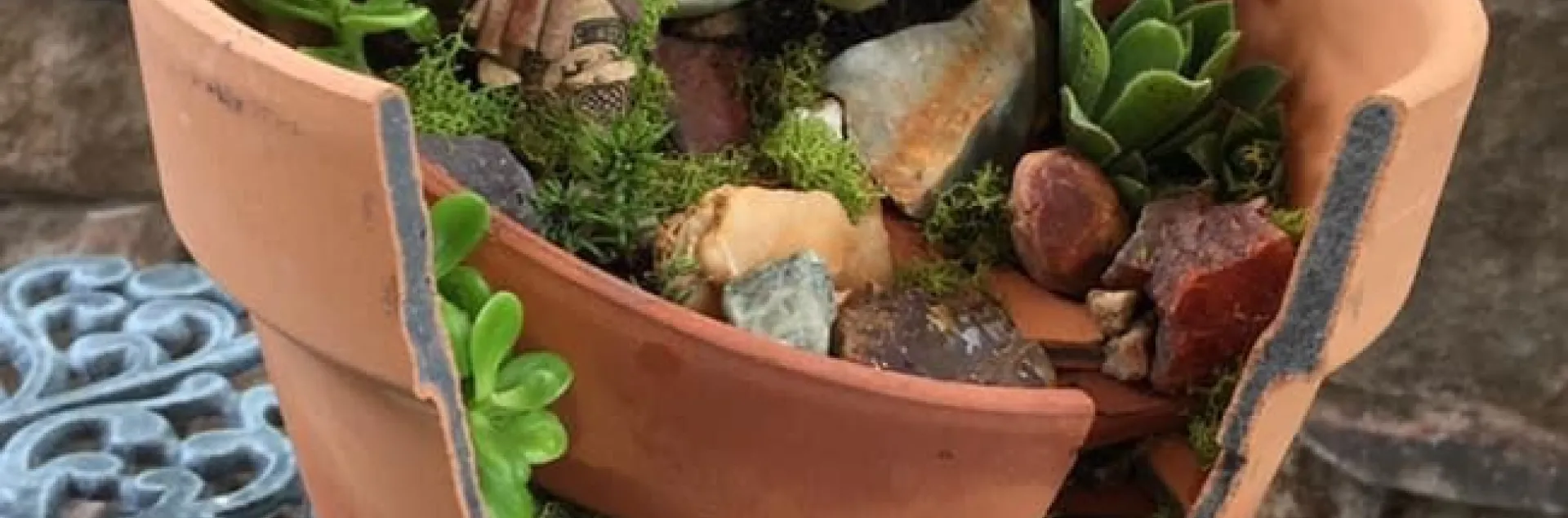 Having seen many pretty pictures of succulent fairy gardens online, I finally decided to attempt one myself. Armed with a hammer, chisel and old towel, I was ready to start on some Dollar Store Terracotta pots. The klutz in me had said to definitely buy more than one pot. Good thing, because the first two tries were total fiascoes. They broke in all the wrong places…