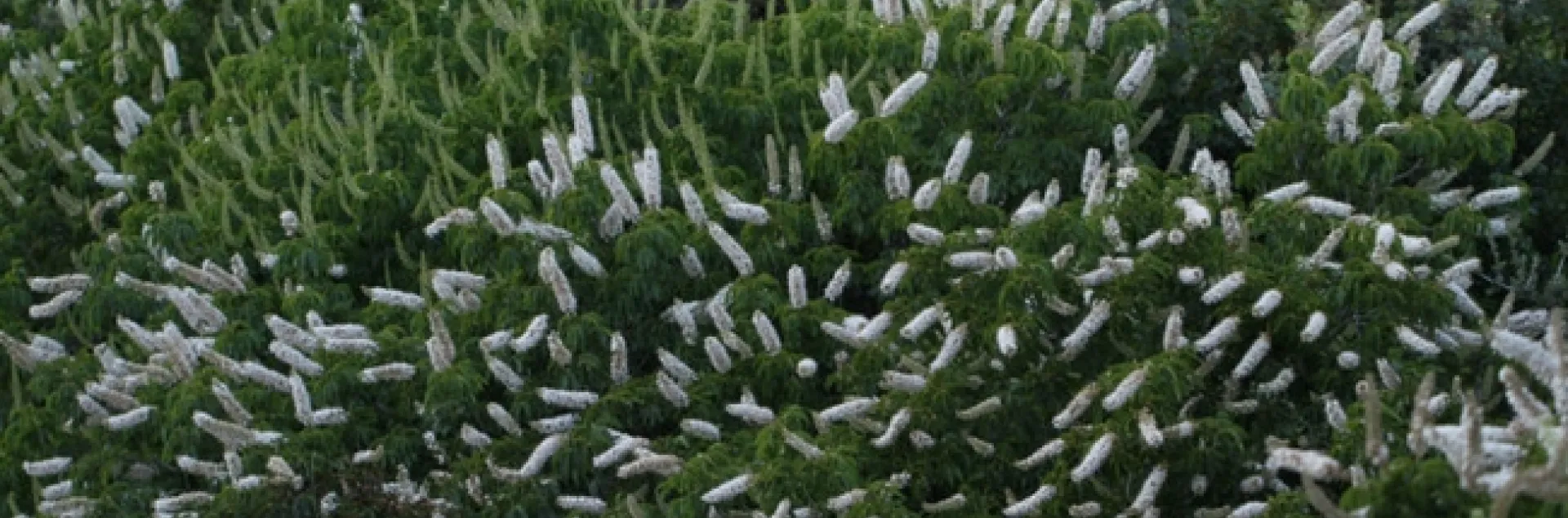 In spring, many people ask me what are those beautiful white trees in bloom? The large, upright candelabra of white blossoms is a magnificent thing to see. While in flower, these trees will be alive with a massive amount of multi-branched, 4-12" inflorescences (flower spikes). Bearing a profusion of fragrant, white to pale pink, flowers with orange stamens. The California buckeye is polygamo-monoecious. A tree with both unisexual and bisexual flowers on the same tree. Because they have all four characteristics of a flower: sepals, petals, stamen, and pistil, bisexual flowers are referred to as “complete” or “perfect” flowers. Most of the 200 or so flowers in each of a buckeye's large inflorescences are male; only about 10 percent have ovaries. Despite the services of pollinators like the variable checkerspot butterfly, less than 10 percent of that 10 percent produce fruit, each typically with a single seed. The Aesculus californica is a nectar source for early spring migrating butterflies, the sequoia sphinx moth, and a host plant for the Pacific azure butterfly. It also attracts native bees and other pollinators.
