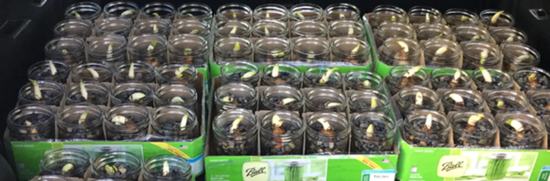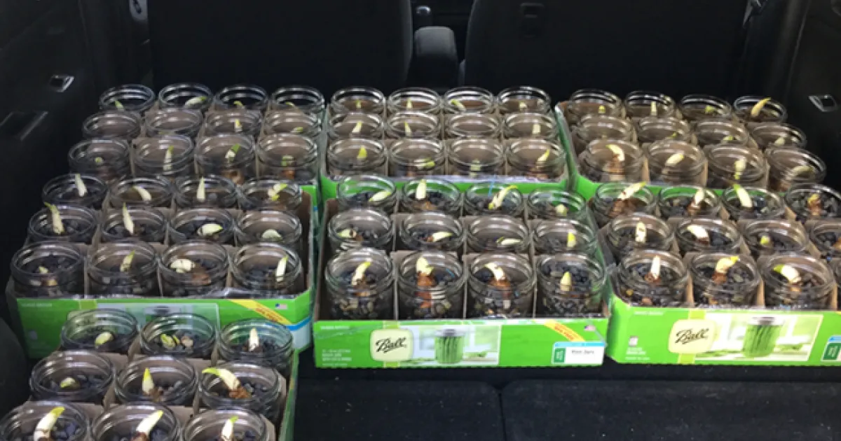 - Dozens of bulbs in canning jars ready for delivery. We have gallon jugs of water in the car and pour the water in right before delivering to the door.