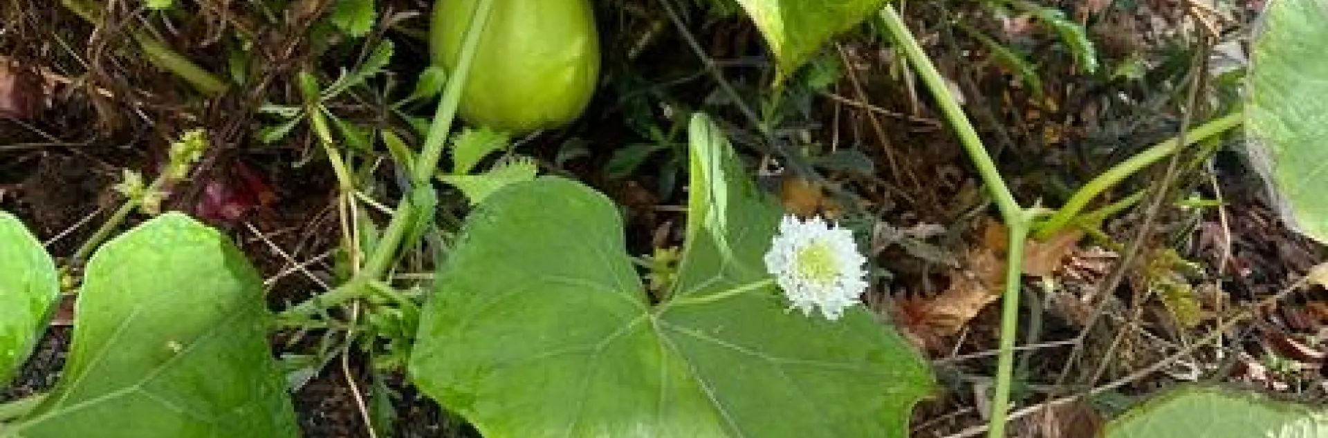 The chayote (Sechium edule) is a member of the Cucurbitaceae family, which includes melon and squash.  The chayote fruit has a flattened-pear shape, is about 4-6 inches in diameter, and is pale to bright green in color.  The fruit grows on a vigorous, large vine that can reach up to 50 feet.  The taste is mild and, in my opinion, takes on the flavor with which it is cooked.  I use it in savory dishes now, but when I lived in the Caribbean, we would use it as the base for an “apple” pie since we couldn't get apples there.