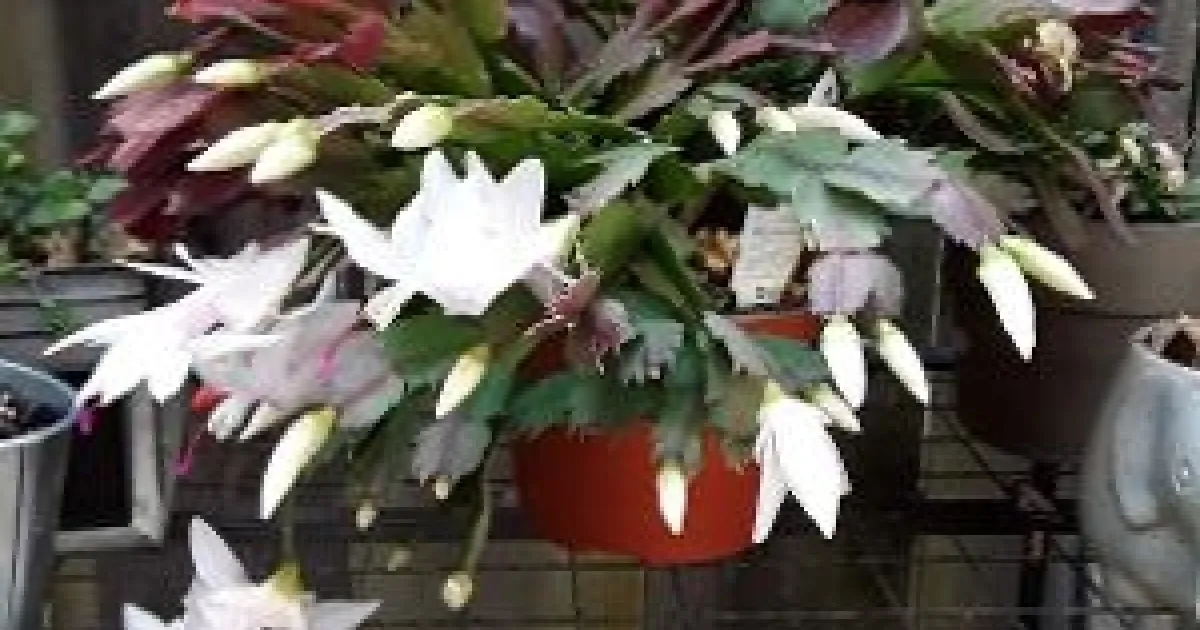 My Christmas Cactus is white flowering, but they come in a variety of colors such as pink, purple, red, and yellow all with a weeping form. My plant is about 4 years old and is not a tall plant, but it does have the weeping not upright buds on the stem end.