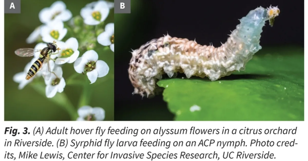 A burgeoning citrus pest, Diaphorina citri, the Asian citrus psyllid is a common meal for the hover fly that is often found hovering around sweet alyssum. It's not the adults that are the adversaries, specifically the hover fly larvae feeds upon the Asian citrus psyllid nymphs. So pairing these two plants together is a great beneficial match to lower the abundance of the asian citrus psyllid which feeds upon the new shoots of all types of citrus trees.