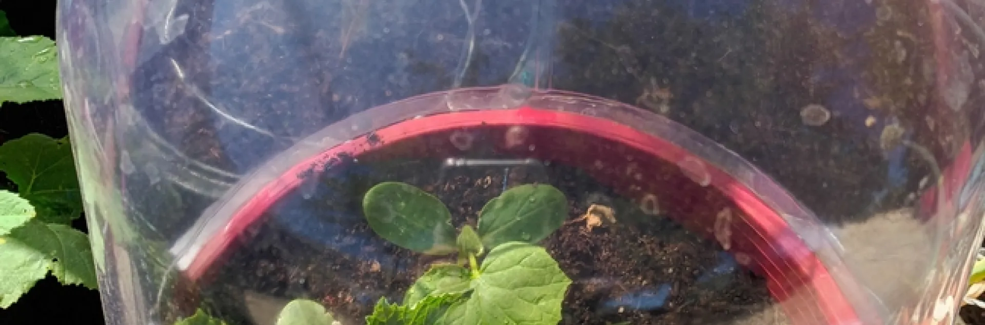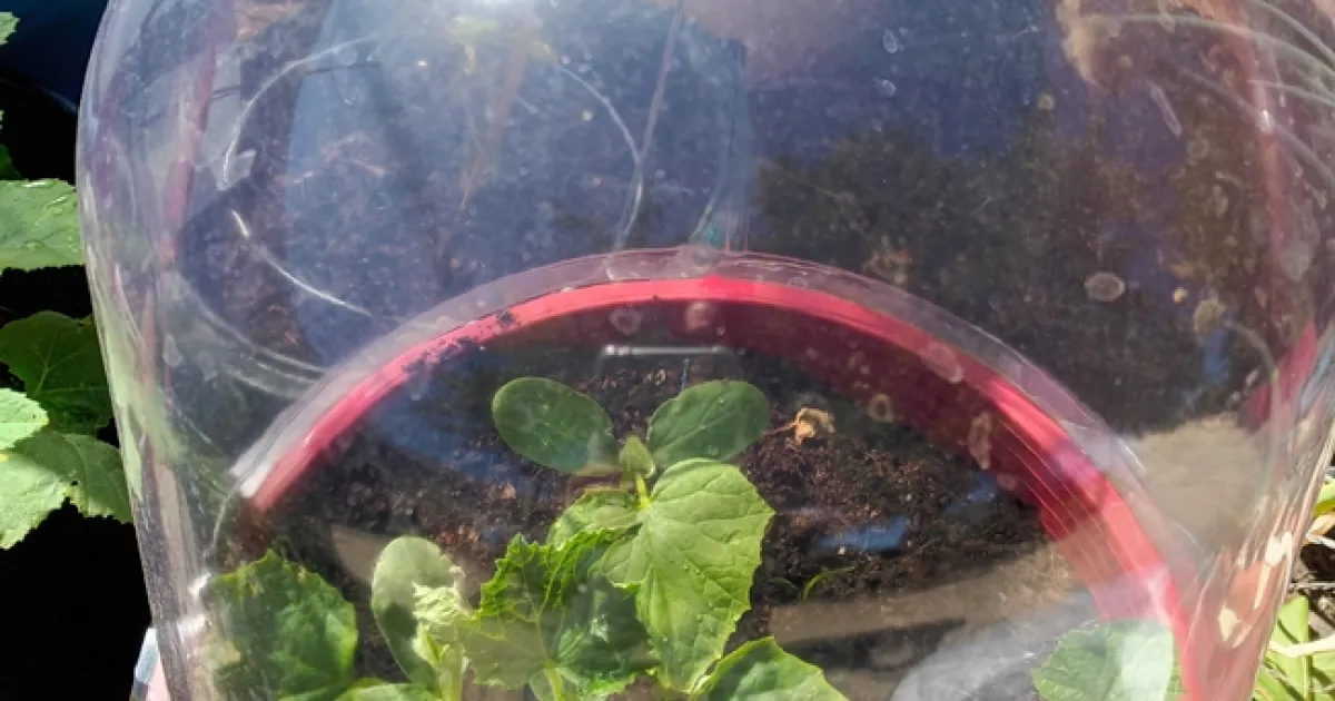Despite the two holes on the top of the plastic cloche, during the day there would be condensation on the cloche if the soil was damp. One of the benefits of both the cloche and the season extender is that they protected the young plants from strong winds and hungry wild rabbits, ground squirrels and other wildlife that like to chew off the tops of young seedlings.