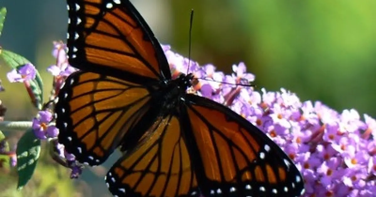 Back in Kansas from Mexico, Sara Dykman author of Bicycling with Butterflies, stops at her parents' home to get ready to continue her journey following the Monarchs. To avoid traffic, she rides on the back roads heading North to Omaha. While in Omaha, she talks to a third-grade class about the Monarchs and looks at the garden they have planted. While exploring the garden, they see a Monarch. As Ms Dykman continues her ride along the border of Iowa and Minnesota she spots a monarch- the first on a dandelion after several days into her trip. In the Twin Cities she sees an orange and black butterfly called a Viceroy (Limenitis archippus). This butterfly is a copycat butterfly that resembles the Monarchs. During her next stop, she spots about 24 Monarchs.