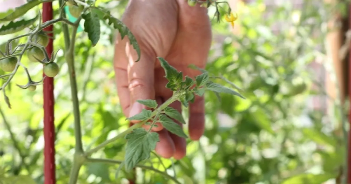 With indeterminate tomato plants, you can manage their sprawl by pruning out its suckers. Be careful, though, that you don't pinch the flower cluster when you prune your tomato. You can tell the difference because the flower cluster doesn't emerge with leaves.