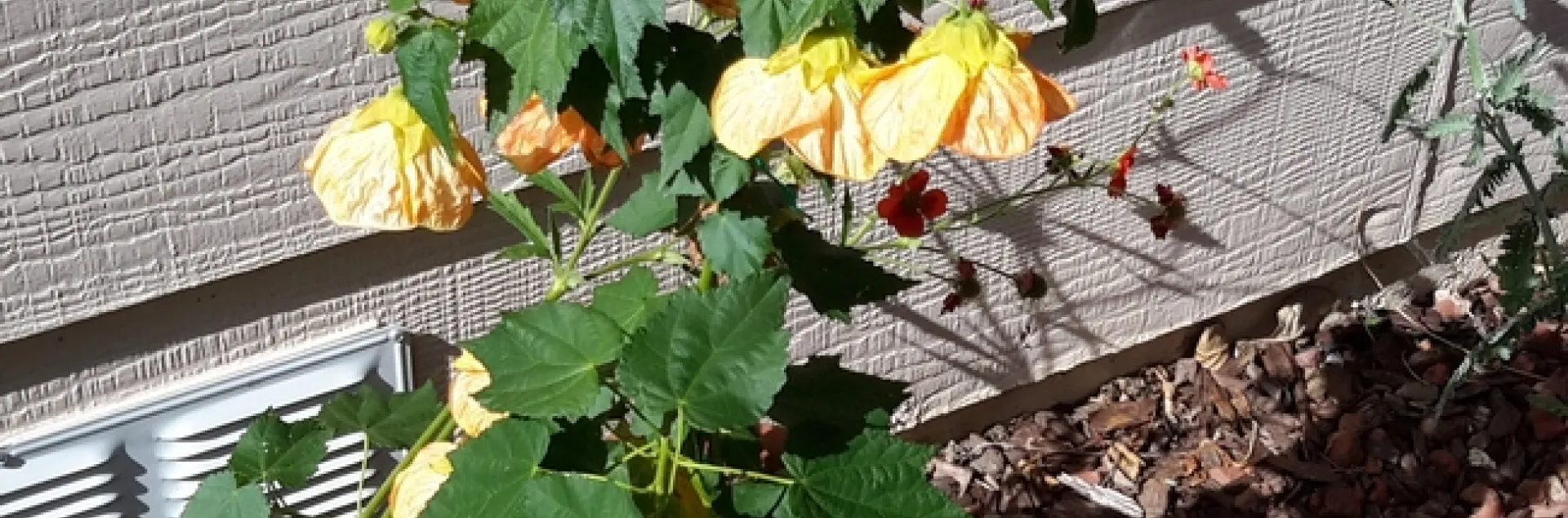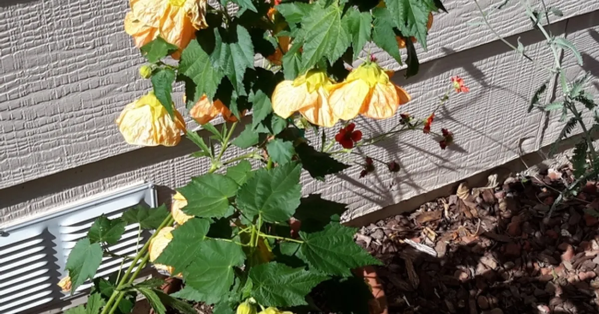 The abutilon belongs to the Mallow family-like hibiscus and Rose of Sharon-you can see the similarities. Other names for abutilon are Chinese Lantern, Chinese Bellflower, and the Flowering Maple but do not belong to the Maple family. They got their common names because of the shape of their leaves.