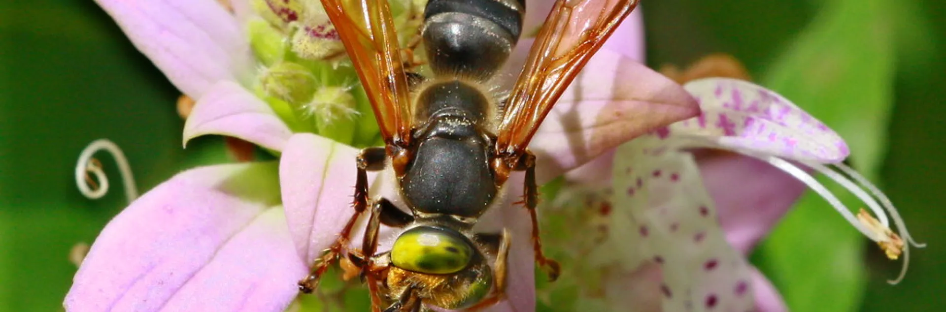 My story is about a kinder, gentler type of wasp, although grasshoppers may not agree with me. The Tachytes distinctus, or green-eyed wasp, is considered a beneficial insect. Females hunt grasshoppers and katydids, which can be plant-eating pests in gardens. They are solitary, ground-nesting wasps, and not aggressive toward people. Adult green-eyed wasps feed on nectar, therefore qualifying as pollinator insects.