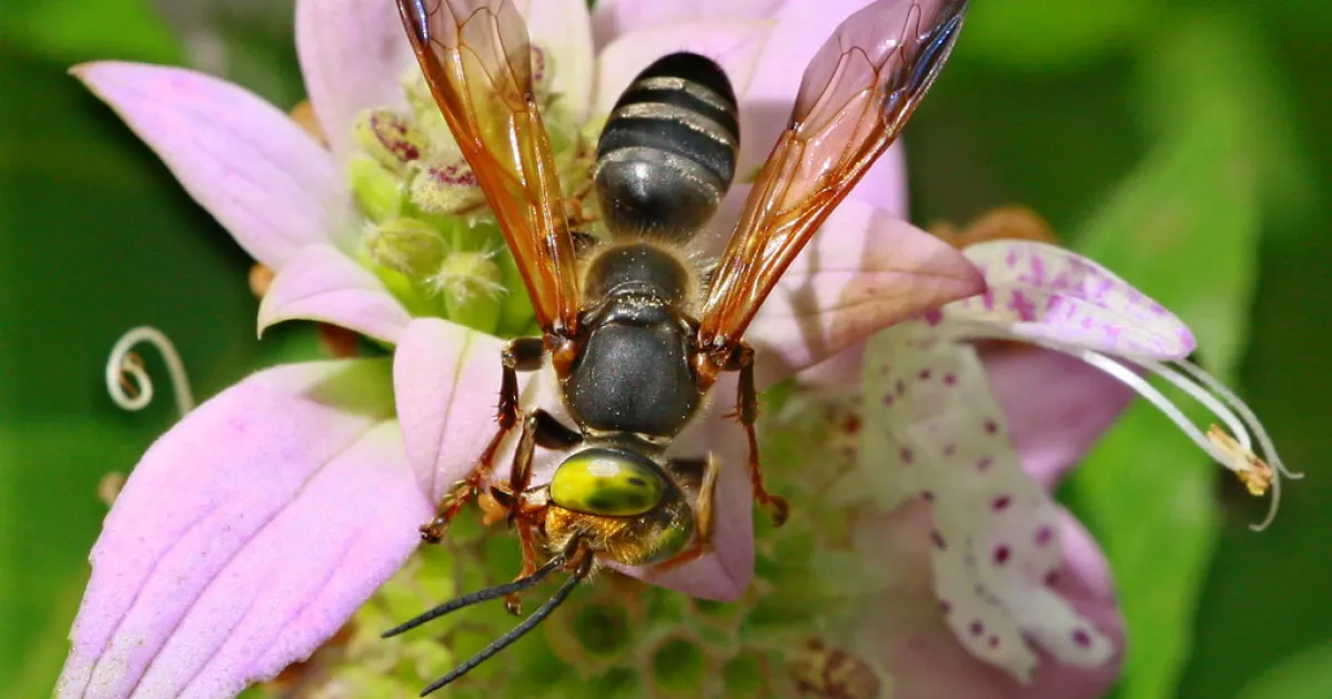 I noticed the presence of green-eyed wasps in my yard before I actually saw the insect. I saw small mounds of dirt with a hole in the center at the base of my concrete raised garden beds. The beds are fed by a drip system, and the bare earth surrounding them is more friable than most of the hard-packed midsummer clay soil nearby. Eventually, I saw a huge insect flying into and out of the holes. The female of this species is quite large, between 16mm – 18mm, while the males range between 14mm – 16mm. More startling than their size are their stunning green eyes.